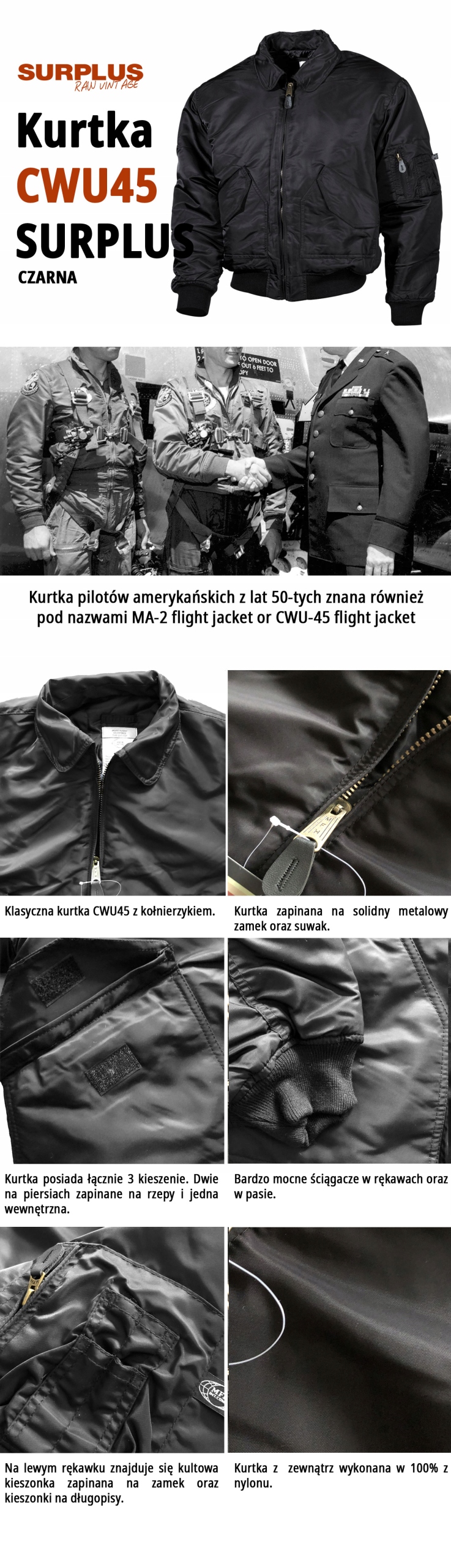 Куртка Max Fuchs CWU45, також звана Ma-2 Bomber Jacket, була розроблена в 1950 році для потреб американської армії та була легендарною курткою пілотів армії США. Модель CWU45 виготовлена з дуже міцного, але приємного на дотик нейлону, що робить її стійкою до механічних пошкоджень і відмінно захищає від дощу або снігу. Всередині куртка наповнена поліефірними волокнами, що зберігає тепло. Куртка має дуже корисний комір, який при носінні відмінно захищає шию і потилицю від холоду. Куртка має 2 зовнішні кишені на липучці, одну на рукаві на блискавці та одну внутрішню. Класична річ, ідеальна для холодних зимових днів.