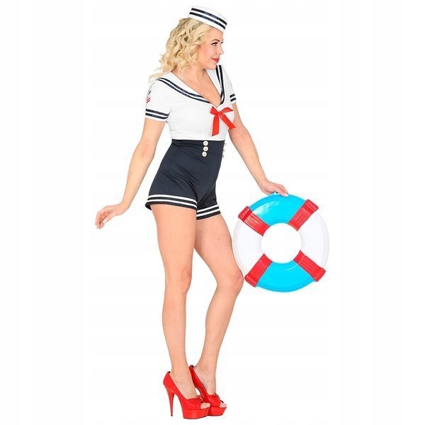 Комбінезон з короткими рукавами білого та темно-синього кольорів, коміром, що спадає ззаду, і червоним бантом спереду.