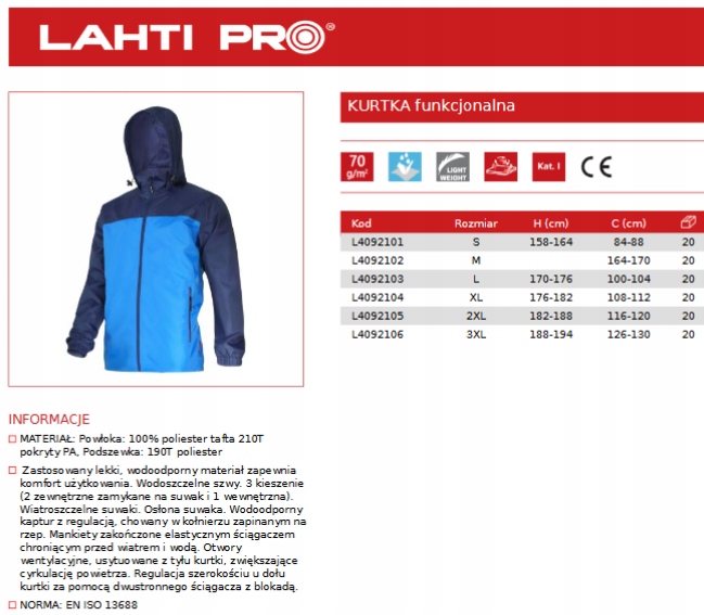Легкі куртки — функціональне доповнення до спорядження професіонала. Мала вага, водонепроникність і водонепроникний капюшон ефективно підвищують комфорт роботи під час сильних опадів. Крій робочих курток LAHTI PRO не сковує рухів, що дозволяє з комфортом виконувати широкий спектр робіт, що вимагають високих фізичних навантажень. Корпус куртки виготовлений із 100% поліефірної тафти 210T, покритої поліакрилом PA. Тафта - це щільна і жорстка тканина, яка шелестить і переливається при русі. Підкладка виготовлена з тафти 190Т. У куртках використовується легкий і водонепроникний матеріал, що забезпечує комфорт під час повсякденного носіння. Куртки Lahti Pro L40921 мають водонепроникні шви. Три кишені, дві зовнішні на блискавці і одна внутрішня. Куртки мають вітрозахисні блискавки та захисну кришку на горловині. Крім того, куртки оснащені водонепроникним регульованим капюшоном, прихованим у комірі, який застібається на липучку. Манжети оброблені еластичною манжетою, яка захищає від вітру та води. Додаткові вентиляційні отвори, розташовані на задній частині куртки, покращують циркуляцію повітря під час використання. Ширина низу куртки Lahti Pro L40921 регулюється за допомогою двосторонньої куліски з замком. Весь одяг Lahti Pro, включно з курткою L40921, має декларацію CE, відноситься до першої категорії засобів індивідуального захисту та відповідає стандарту безпеки EN ISO 13688.