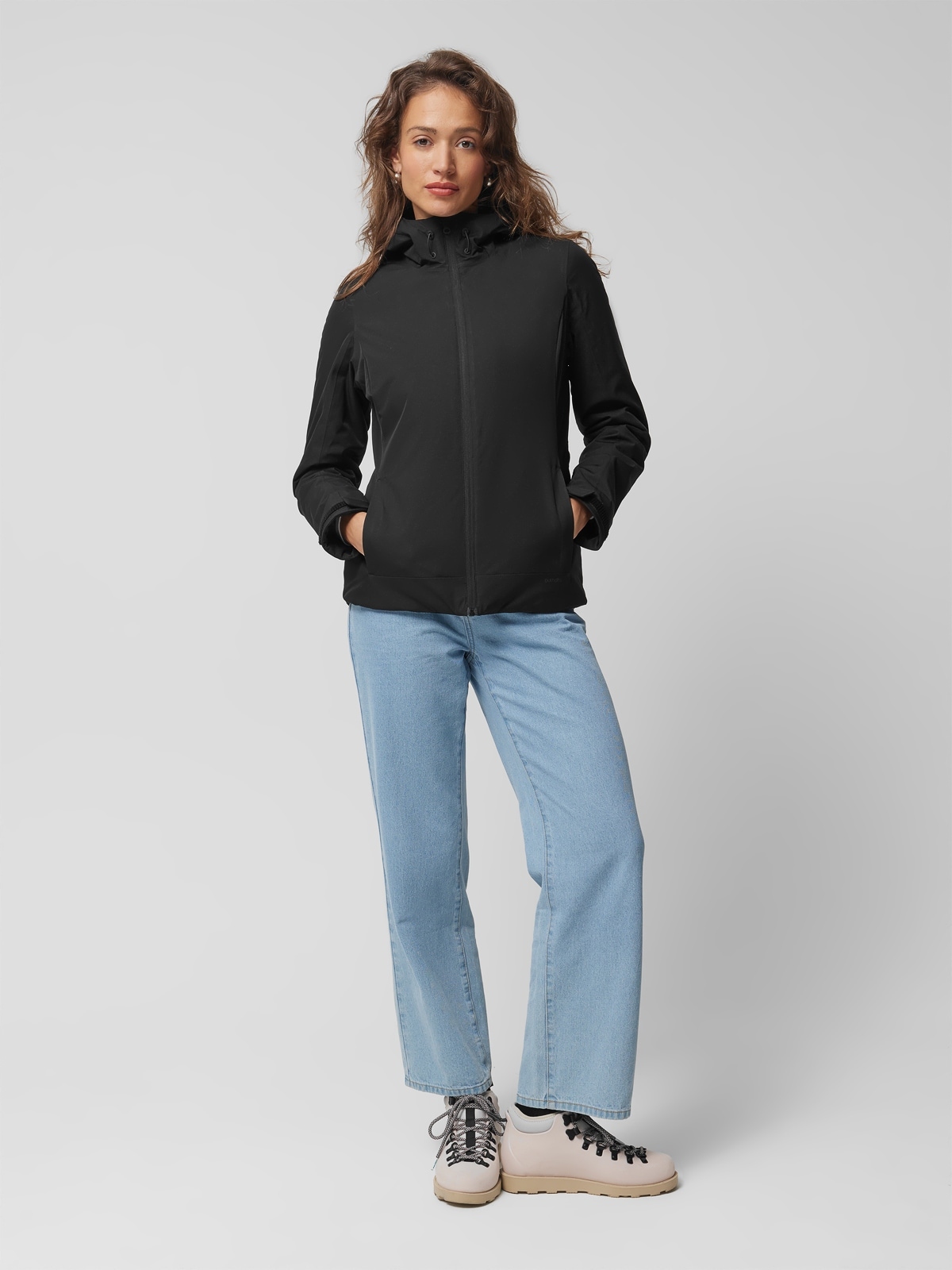 Вбудований регульований капюшон зі стопором. Високий комір-стійка для захисту від холоду. Основна застібка на блискавку та внутрішній вітровий клапан із захистом підборіддя. Дві передні кишені застібаються на блискавку, приховану під складкою. Всередині є відкрита кишеня і застібка на липучці. Рукава з регулюванням на липучках. Нижнє регулювання за допомогою стопора. Стьобана підкладка і синтетичний утеплювач захищають від холоду.