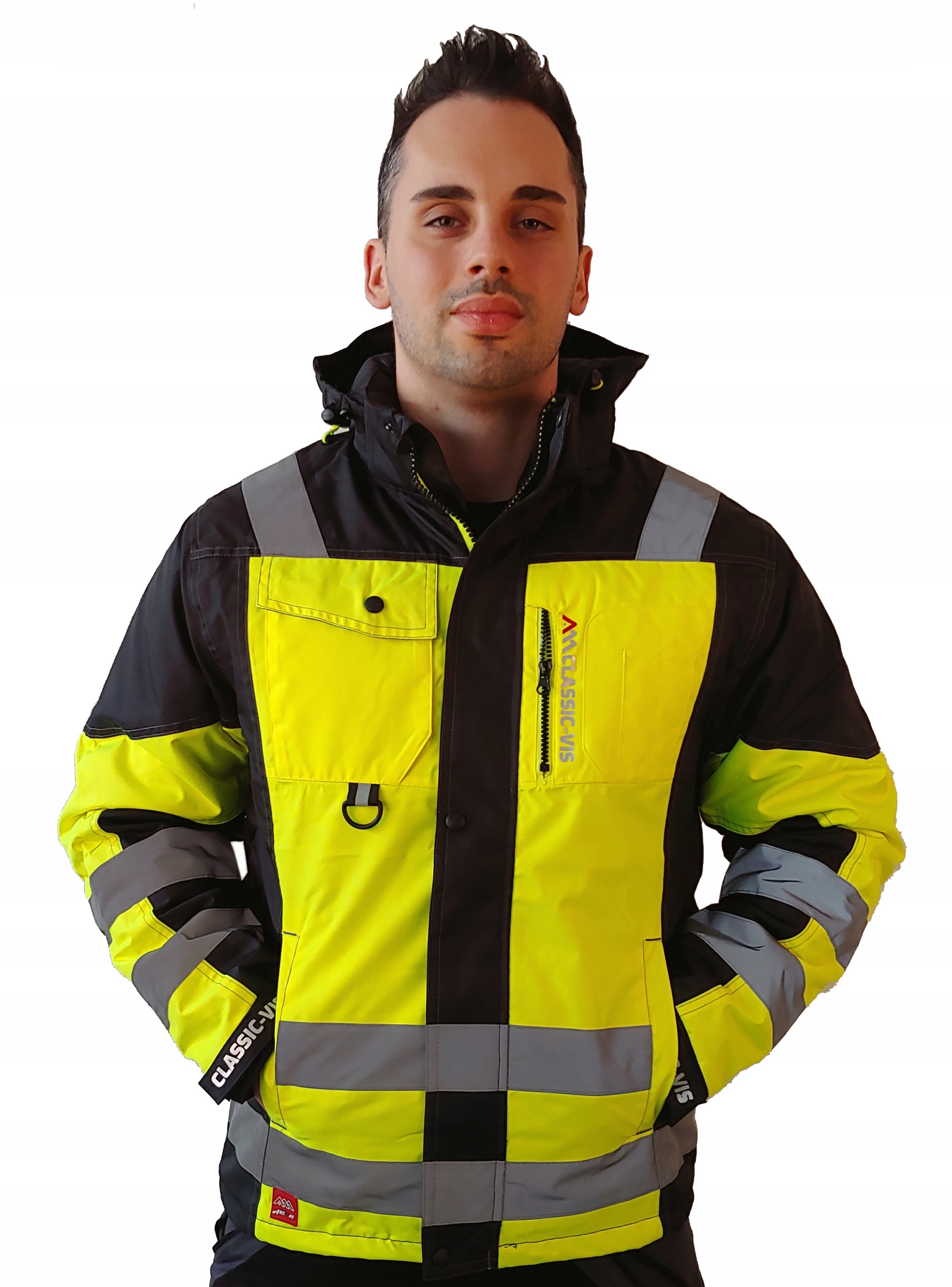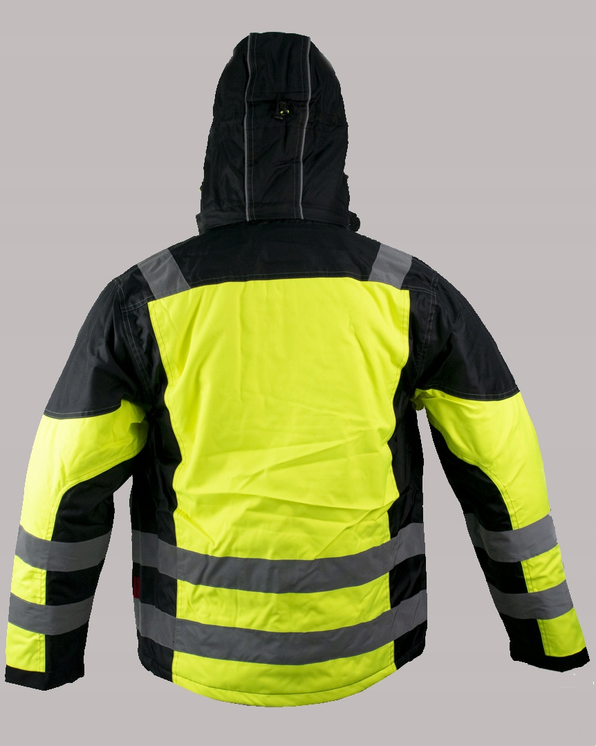 Утеплена куртка з водонепроникного поліефірного матеріалу Oxford 300D з поліуретановим покриттям усередині, флуоресцентно-жовтого та чорного кольору зі світловідбиваючими смугами. Утеплювач з поліестеру та стьобана підкладка.