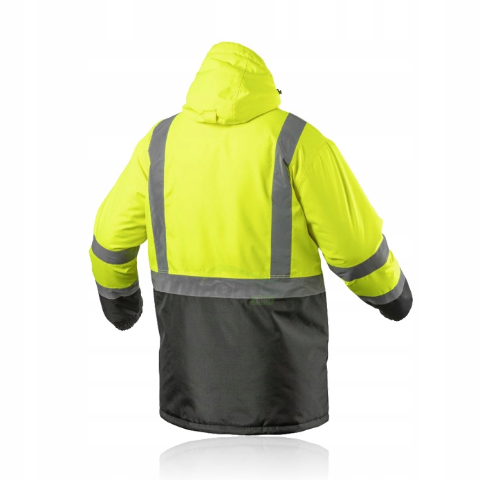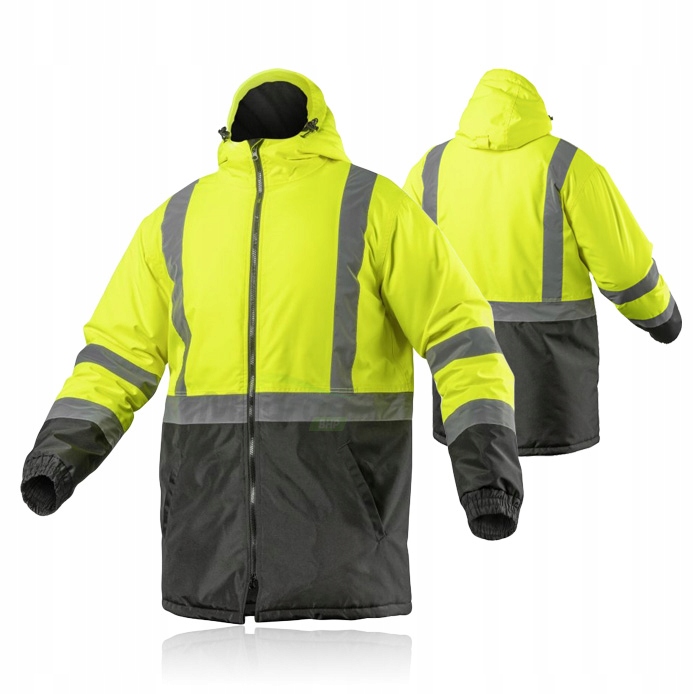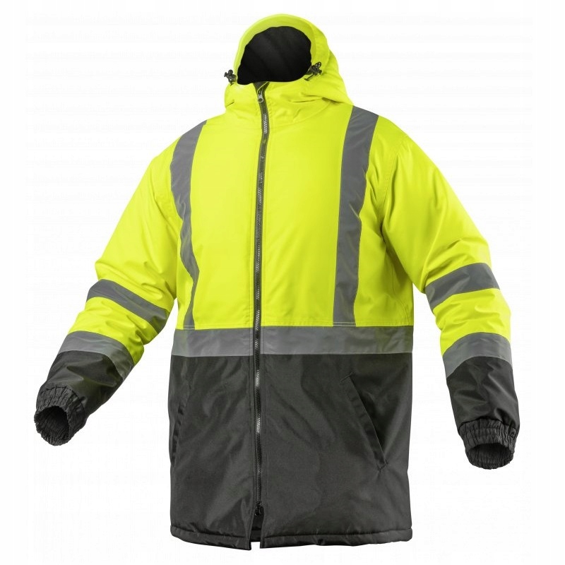 ✔ Сучасна утеплена чоловіча куртка попереджувального типупарка. Він має дві світловідбиваючі стрічки навколо плечей і рукавів і одну стрічку навколо тулуба.