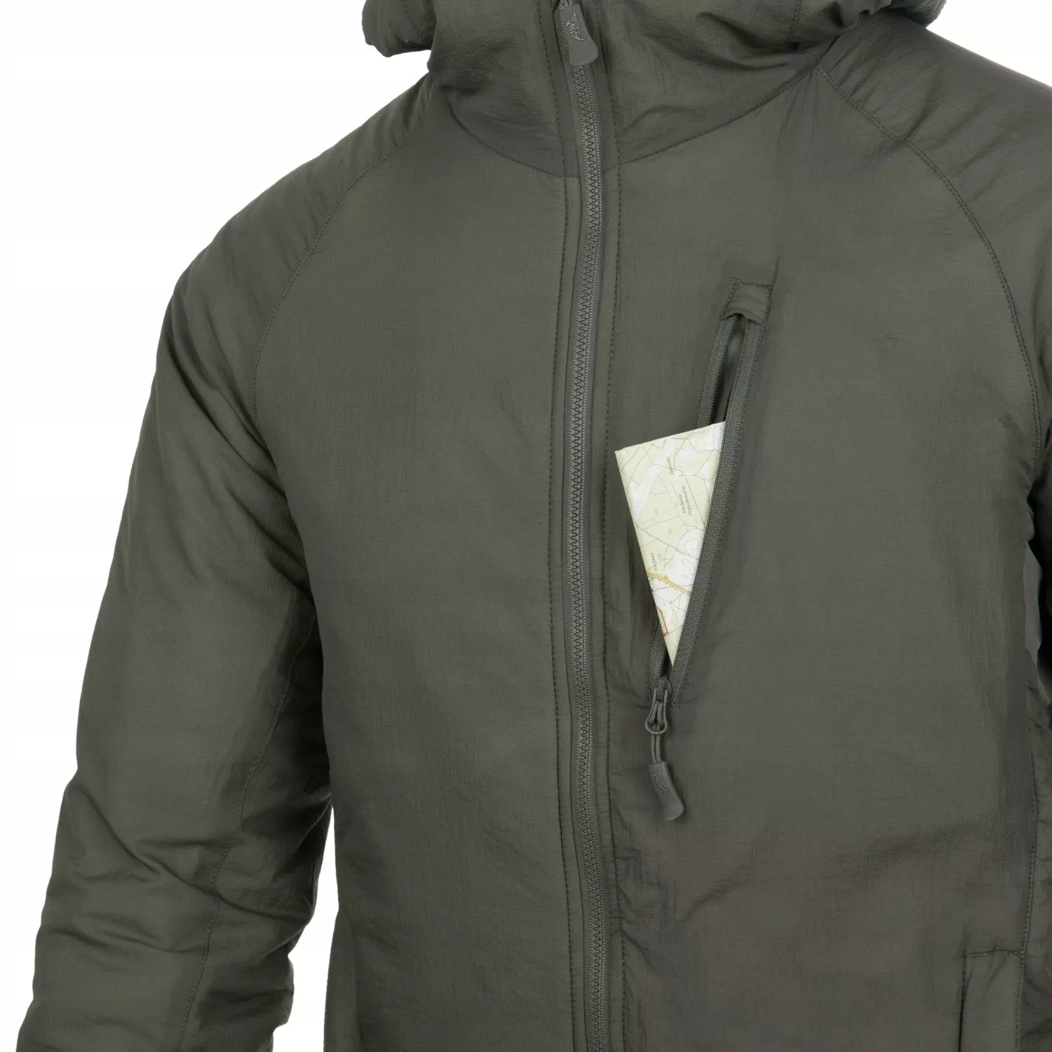 Helikon Wolfhound Hoodie - це легка куртка з капюшоном, яку можна використовувати як самостійний утеплюючий шар або як ізоляційний шар у поєднанні з софтшеллом або хардшеллом. Утеплювач Climashield Apex, який використовується в куртці, зігріває користувача в будь-яких умовах. Якщо він намокне, він швидко висихає.