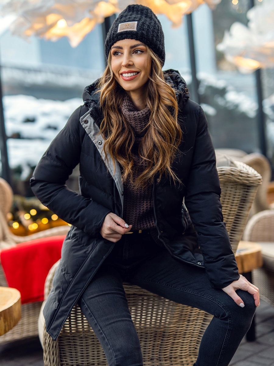 Чорна довга стьобана куртка, жіноче зимове пальто з капюшоном, Bolf 7091, розмір XL