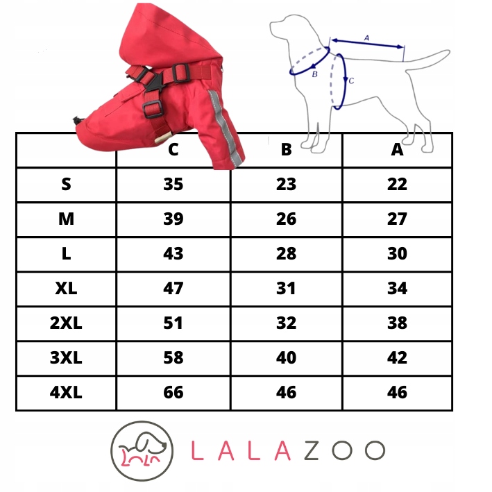 We check the size of the chest (c,) first in the second step, the length of the back (a), only at the end of the neck circumference (b/) the least important because it can be loose;) - remember that in the table we give maximum values,
