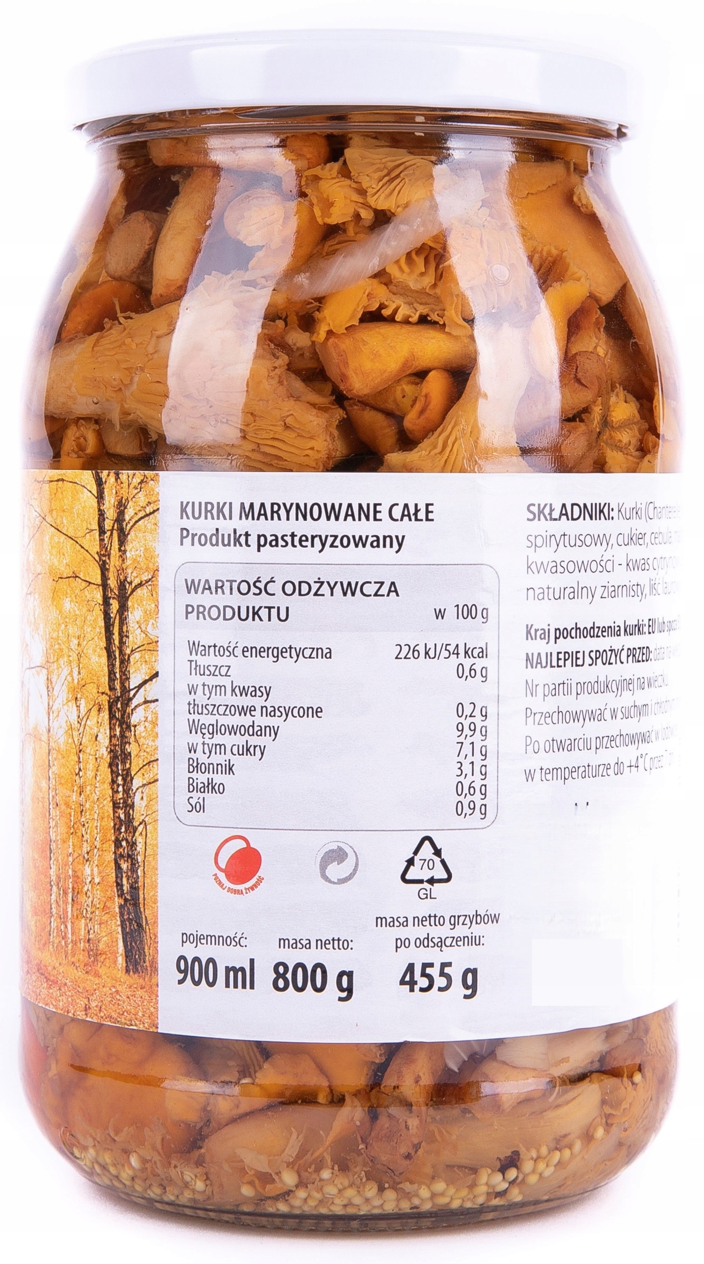 Склад: Лисички (лисички), вода, оцет спиртовий, цукор, цибуля ріпчаста, морква, сіль, регулятор кислотності, гірчиця. , перець горошком натуральний, лист лавровий.
