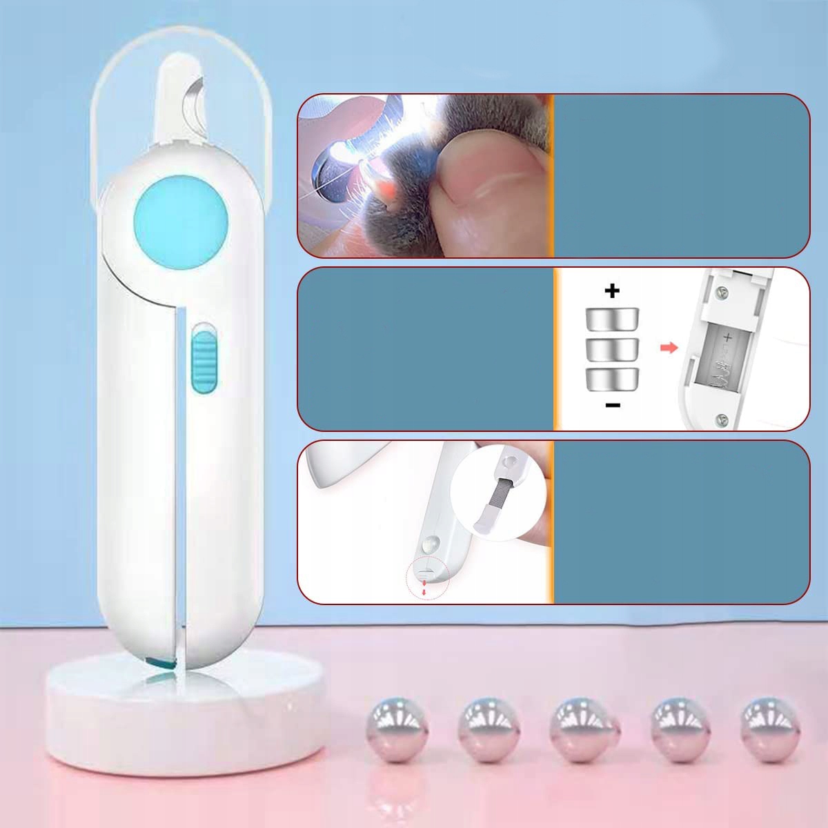 【Яскраве світлодіодне підсвічування】Когтерізка для домашніх тварин має 2 вбудовані світлодіодні кульки. з високою яскравістю, яка освітлює та концентрує зір і полегшує підстригання нігтів. Машинка для стрижки нігтів постачається з 3 кнопковими батарейками, будь ласка, вставте батарейки. Щоб працювати, увімкніть світло кнопки перемикача.
