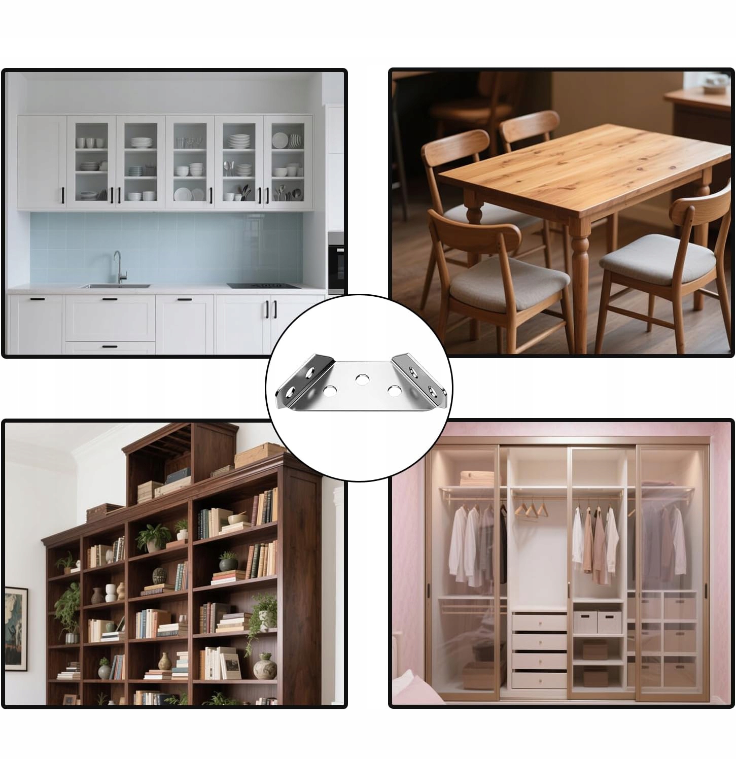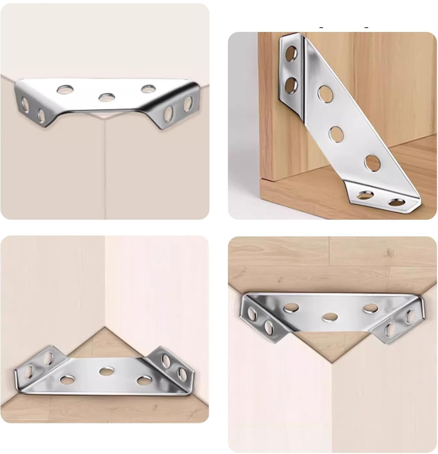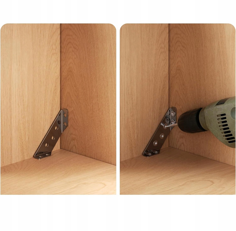 кімнати. Їх можна використовувати для фіксації кутів, як кутові кронштейни до ніг столів, кутових кронштейнів для стільців, кутових кронштейнів для ліжок, кутових кронштейнів для шаф, кутів для шаф тощо підходять для з'єднувальних столів, шаф, полиць, стільців, шаф, вікон, ящиків та інших дерев’яних меблів для виправлення та ремонту їх. Вони є ідеальним вибором для зміцнення металевих меблевих елементів.