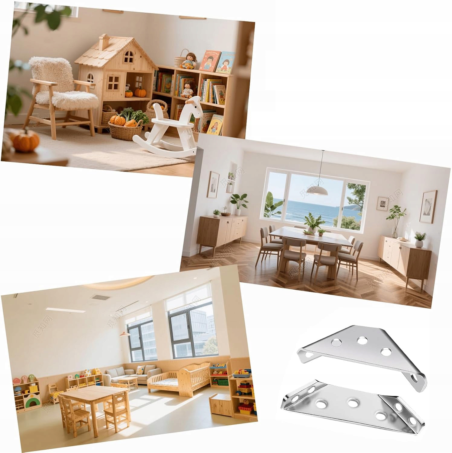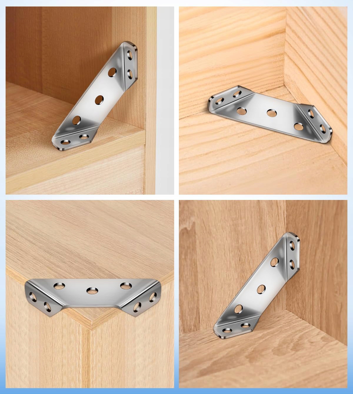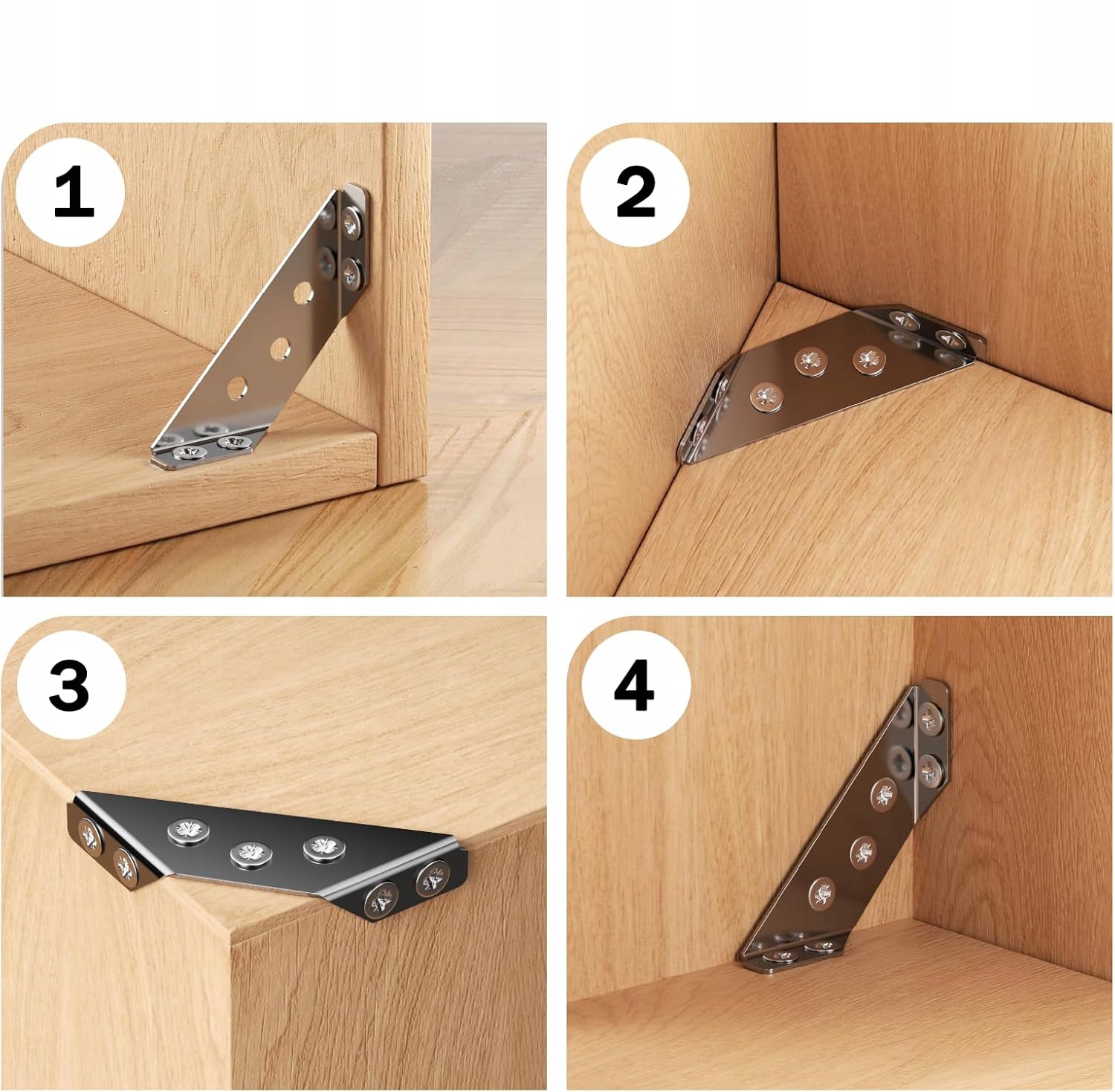 кімнати. Їх можна використовувати для фіксації кутів, як кутові кронштейни до ніг столів, кутових кронштейнів для стільців, кутових кронштейнів для ліжок, кутових кронштейнів для шаф, кутів для шаф тощо підходять для з'єднувальних столів, шаф, полиць, стільців, шаф, вікон, ящиків та інших дерев’яних меблів для виправлення та ремонту їх. Вони є ідеальним вибором для зміцнення металевих меблевих елементів.