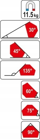 Магнітний кут, виготовлений із сталевого листа та сильних феритових магнітів. Це дозволяє точно поєднувати матеріали під наступними кутами: 30 °, 45 °, 60 °, 75 °, 90 ° та 135 °. Ємність магніту прибл. 11,5 кг. Порошкова лакована поверхня. Розроблений для тимчасового поєднання металевих елементів при зварюванні, бурінні, лакуваннях, діяльності, що вимагають використання обох рук. Використання магнітного кута дозволяє вільно працювати з руками та виконувати діяльність без допомоги додаткової людини. Це дозволяє попередньому монтажі з'єднаних металевих елементів. .