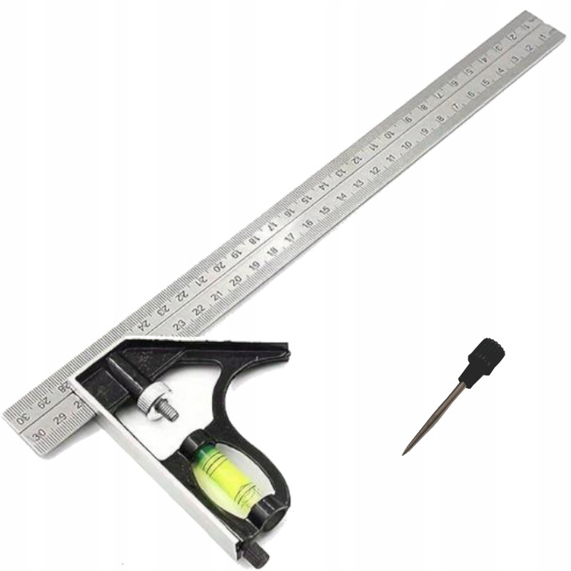 Точний косинець довжиною 300 мм із вбудованим рівнем і розмічальним стрижнем для розмітки відстаней.