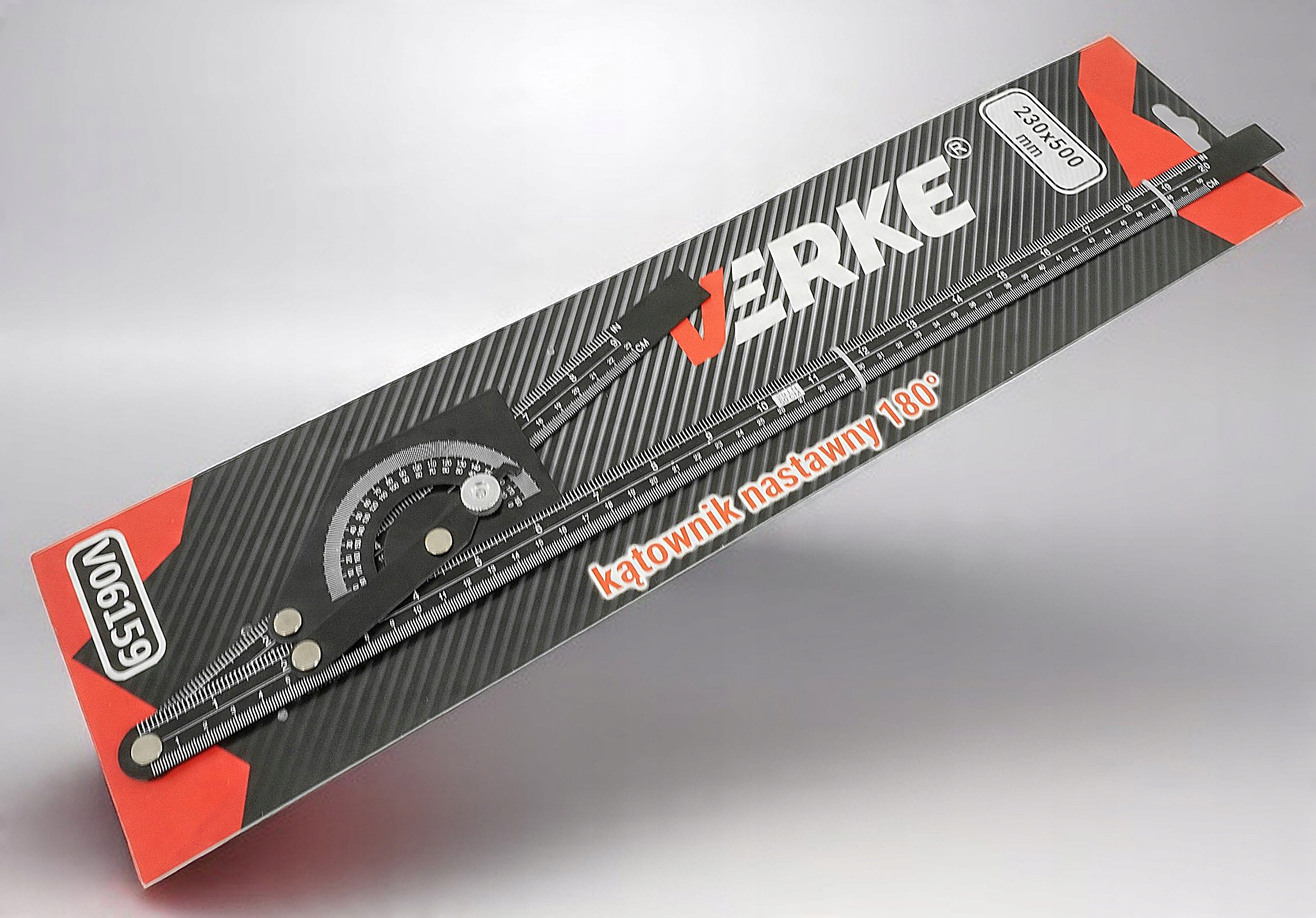 Регульований кутник з алюмінію. Він дозволяє проводити точні вимірювання та будувати кути в діапазоні від 0° до 180°. Виготовляється з двох ребер довжиною 230 мм і 500 мм.