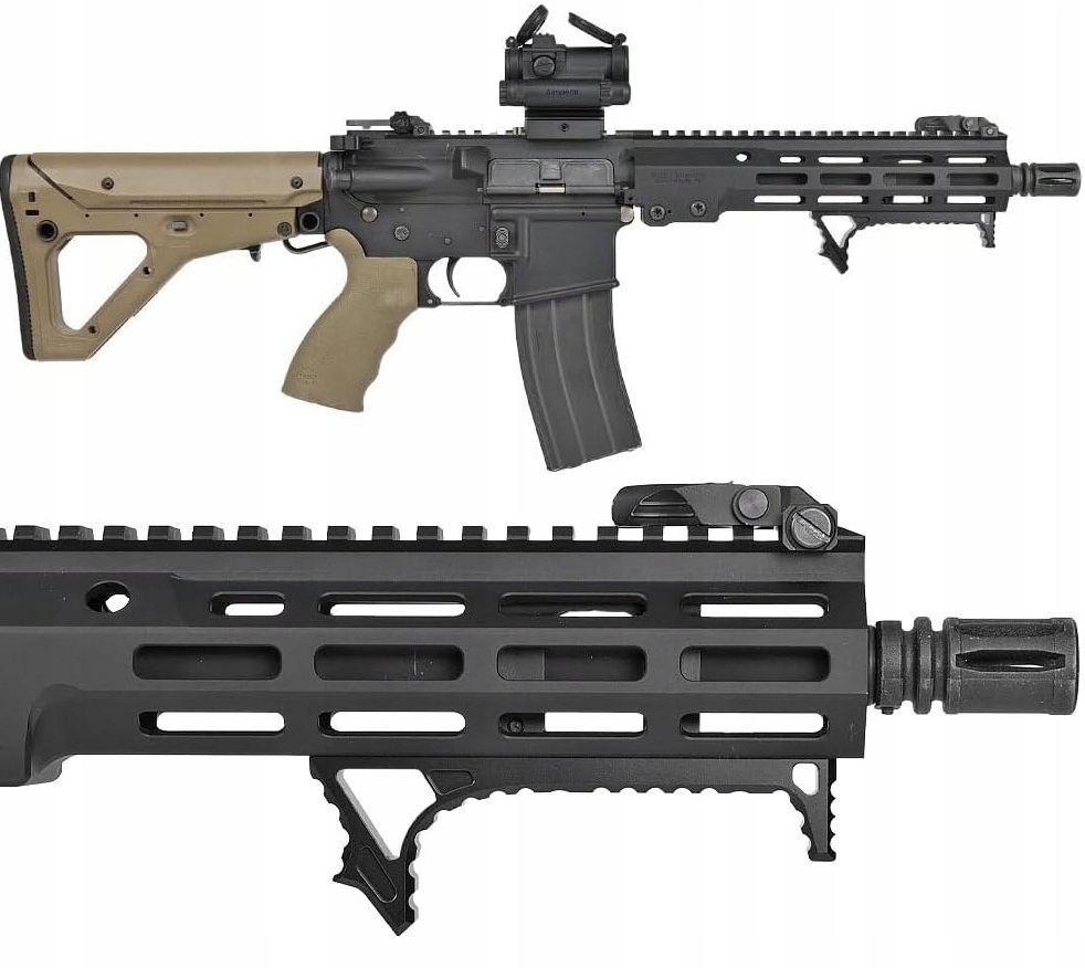 - Універсальна збірка M-LOK - швидка і надійна установка на рукоятки з системою M-LOK, повна сумісність з карабінами AR-15, AK та іншими платформами.