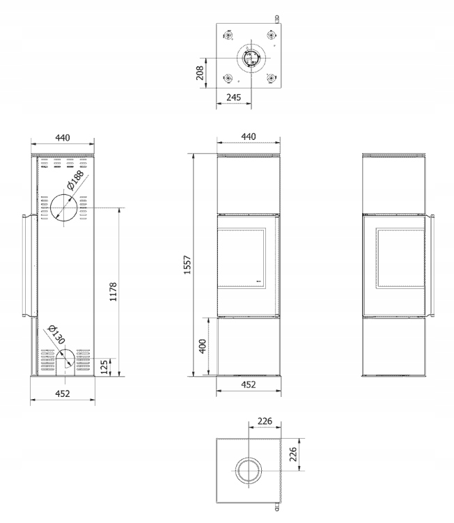 Регульовані ноги дозволяють зменшити нерівномірність підкладки та вирівняти печі. Полегшена установка печі завдяки отворі в основі - Ø200 мм. RHEAN можна встановити з з'єднанням зверху або ззаду. Підключення печі зверху дозволяє заощадити простір, а підключення зі спини робить труби менш помітними, що може бути корисним для тих, хто піклується про мінімалістичний вигляд. Вибір між з'єднанням зверху та ззаду залежить від індивідуальних уподобань, умов встановлення та естетики приміщення.