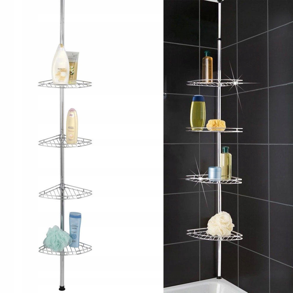надзвичайно містка, телескопічна полиця душ для ванної кімнати зробить ваші аксесуари для ванни завжди під рукою. У ньому аж 4 рівні , на яких кожне домогосподарство може встановити свої улюблені гелі, шампуні або інші миття посуду. Він підходить для встановлення в кутку ванни та в душі. Він також може бути використаний для загального використання у ванній кімнаті. Установка не вимагає буріння або склеювання - полиці достатньо для встановлення, клініруючи між підлогою та стелею. Можливість регулювати висоту з 56 до 275 см дозволяє адаптувати полицю до індивідуальних потреб. Структура стрічки забезпечує вільне втечу капаючої води.