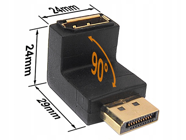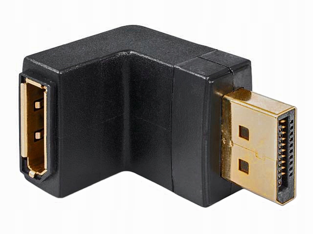 Пропонований адаптер змінює спосіб вставлення штекера DisplayPort - завдяки цьому ми можемо зручніше прокласти кабель. Часто розетка DP вимагає розміщення кабелю перпендикулярно задній стінці монітора або телеприймача (монітора, проектора). Пропонований нами адаптер дозволяє прокласти кабель паралельно стінці приймача, завдяки чому кабель захищений від пошкоджень (через надмірне згинання), а гніздо DP від розриву. Пропонований перехідник являє собою перехід, який відхиляє кабель вниз або вгору (в залежності від розташування розетки) на кут 90°. Ми також пропонуємо кутові адаптери, які відхиляють кабель вліво або вправо.