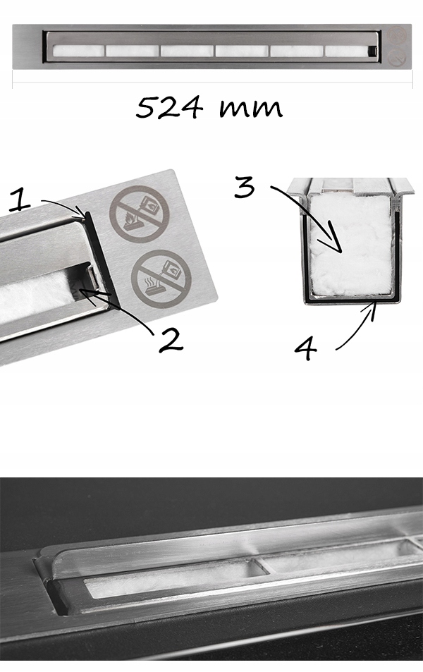 Біокамін оснащений однією лінійною пальником шириною до 524 мм із сертифікатом безпеки TüV, який із шириною біокаміна 600 мм гарантує вражаючу лінію вогню.