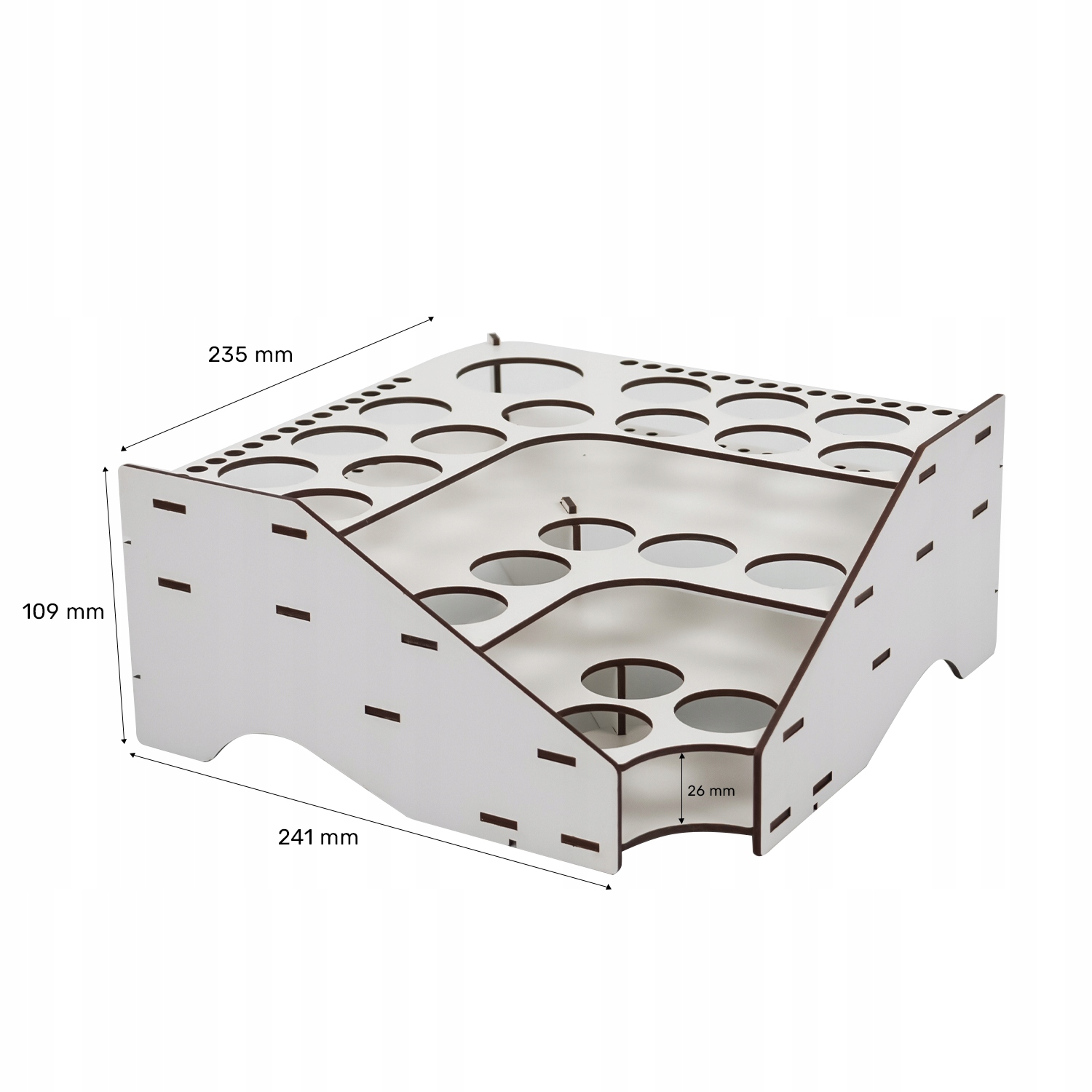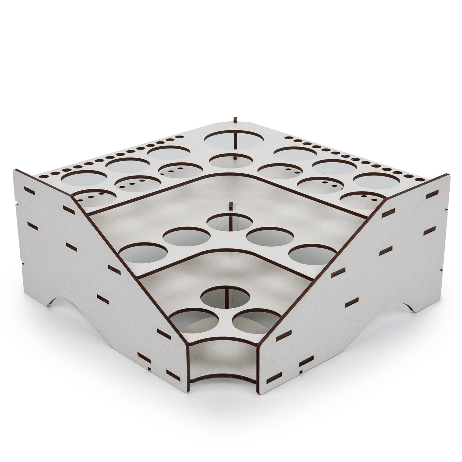 52 точно вирізані отвори трьох розмірів (53 мм, 32 мм, 8 мм), що відповідають популярним маркам фарб, таким як Citadel, Vallejo, Apple Barrel, FolkArt і Tamiya.