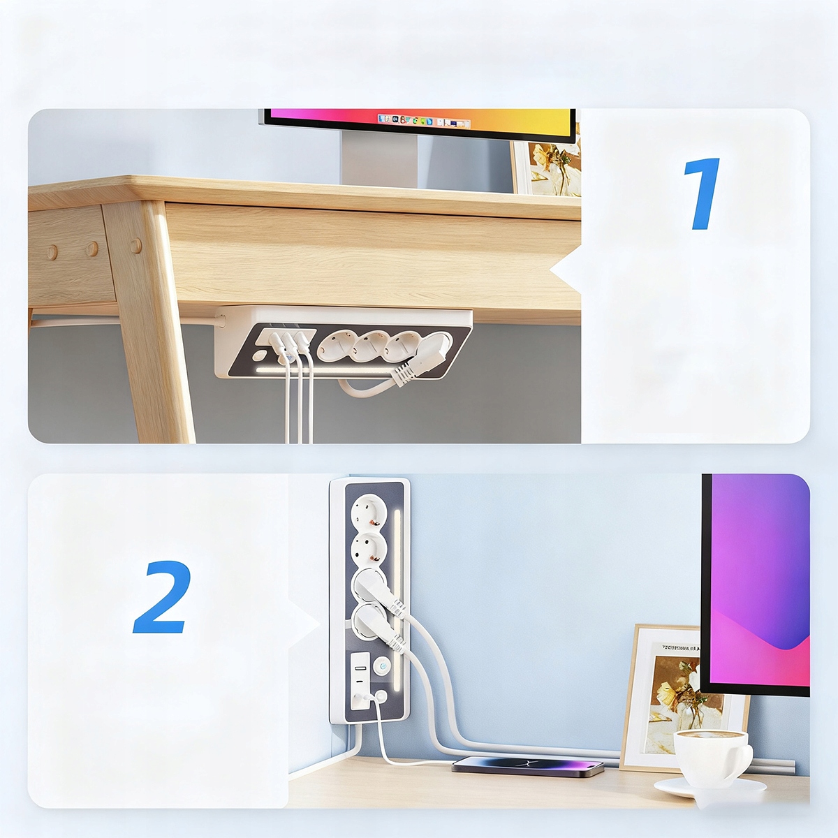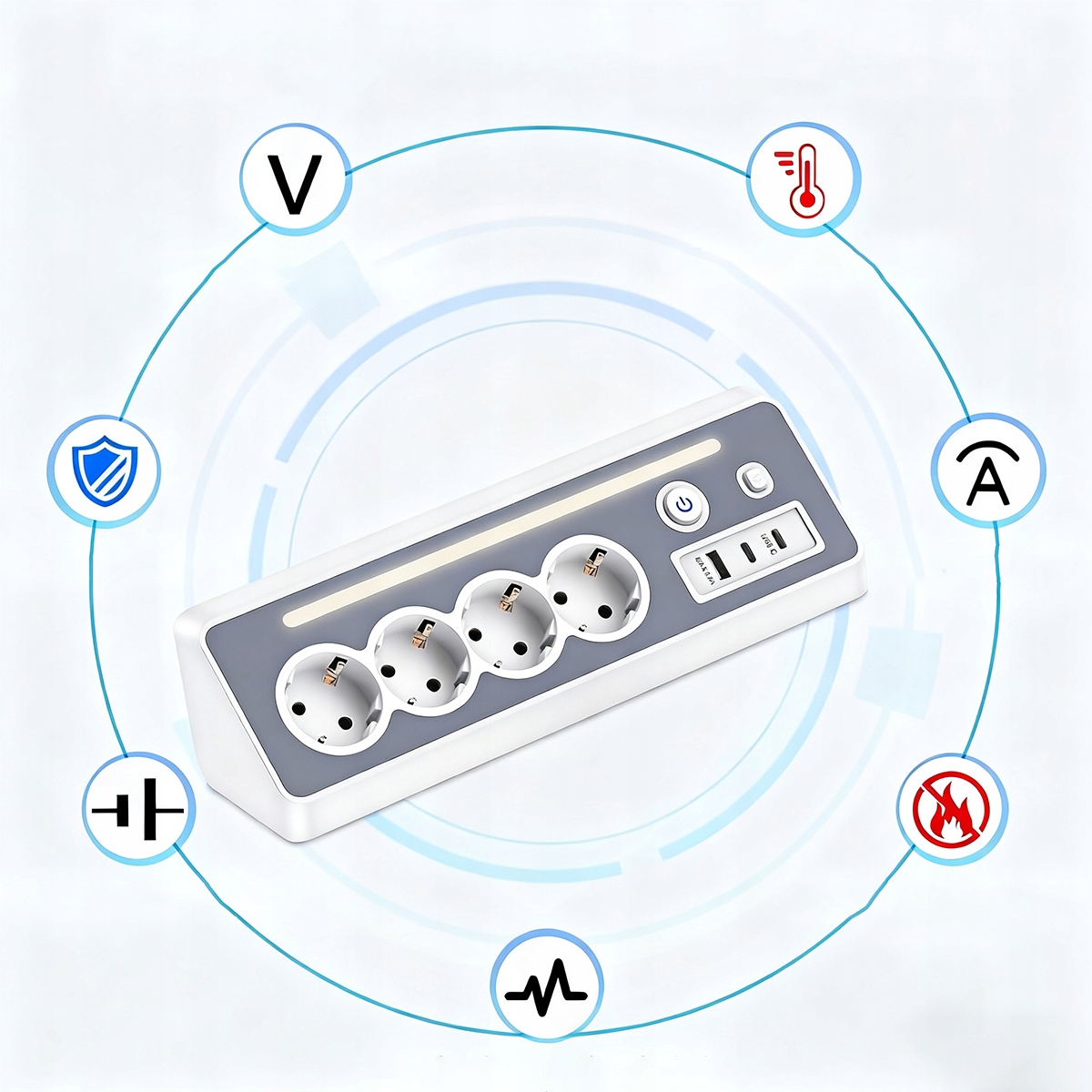 Багатофункціональна розетка з 4 розетками (3680 Вт/16 A), 2 USB-C, 1 USB-A, портами (загальна потужність 5 В/3,4 A) і 1 світлодіодним нічником для зберігання енергії, 2 вимикачами. Залежно від ваших потреб ви можете використовувати ці багаторазові розетки в офісі, кухні, спальні, вітальні тощо.