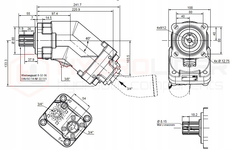 Конструкція 7-поршнева, нахил осі поршня відносно осі вала 40°. Компактна і компактна конструкція, передній підшипник також центрує насос. Монтаж кріплення Фланець ISO кріпиться за допомогою 4 гвинтів, відстань 80x80 мм; центральний замок 80 мм, шліцьовий вал 8-32-36, задні масляні порти, всмоктувальний порт під кутом 45° включено.