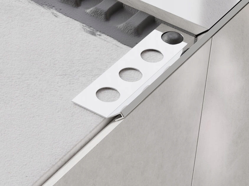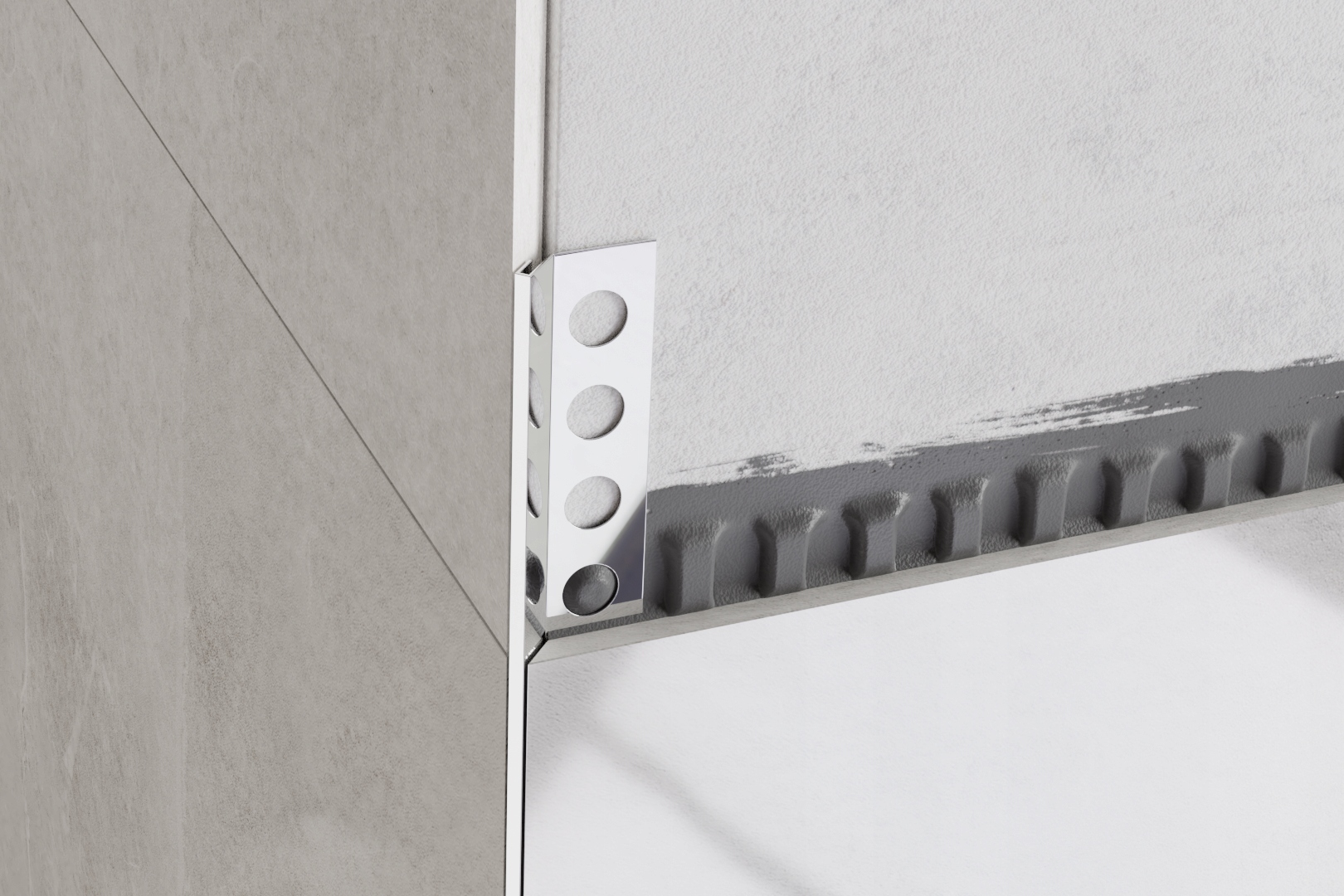 Універсальний профіль R (кут для вирізаних плиток під кутом) дозволяє збільшити естетику Край кутів, при цьому збільшуючи витривалість. Край вирізаних плиток. Завдяки мінімалістичній декоративній поверхні, профіль не відрізняється від тла плитки. Збільшує міцність з'єднання - ширина прикрас (3 мм) захищає кут від можливих бризок