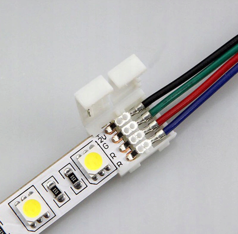 Кутовий роз’єм із обтиснутим вручну кабелем для світлодіодних стрічок RGB із 4 точками пайки. Він дозволяє швидко з'єднати дві світлодіодні стрічки SMD 5050 шириною 10 мм по кутах без використання паяльника. Просто розмістіть стрічку належним чином і закрийте засув. З’єднувачі легко знімаються. Вони багаторазові. Роз’єм можна закріпити на звичайній або водостійкій RGB-стрічці (після зняття силіконової кришки).