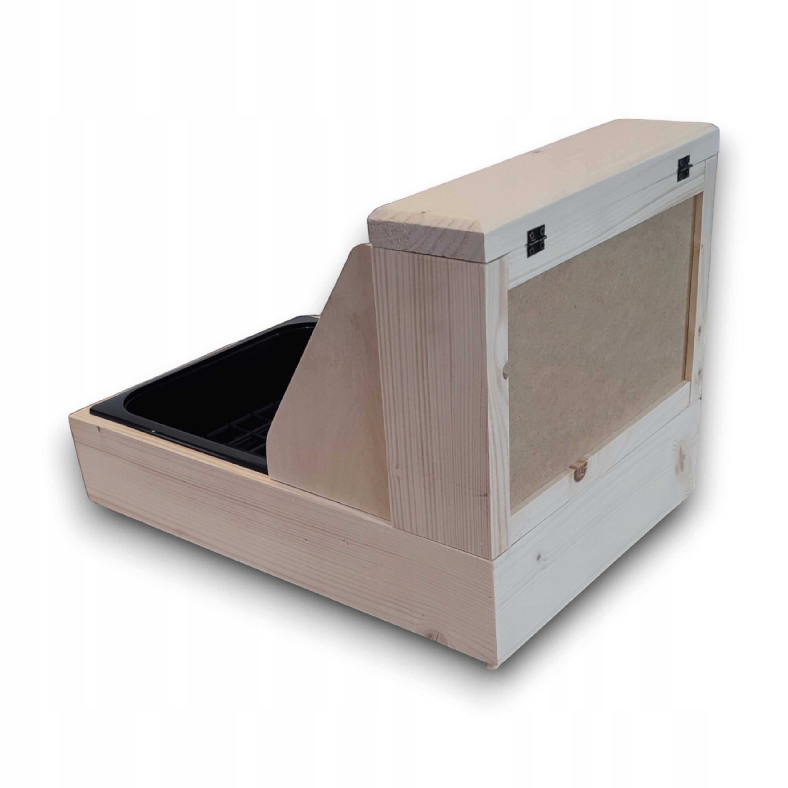 Найменший лоток для найменших міні-лопа, Тедді (перського карлика), мініатюрного ягняти, міні-рекса, гнома Хотота , карликовий голландський, а також для морських свинок тощо. Виготовлений з натурального матеріалу, наприклад з масивної дошки, в комплект входить відповідний ящик для сміття з решіткою (решіткою) і кришками, які захищають від розсипання сіна чи будь-яких сухих трав.