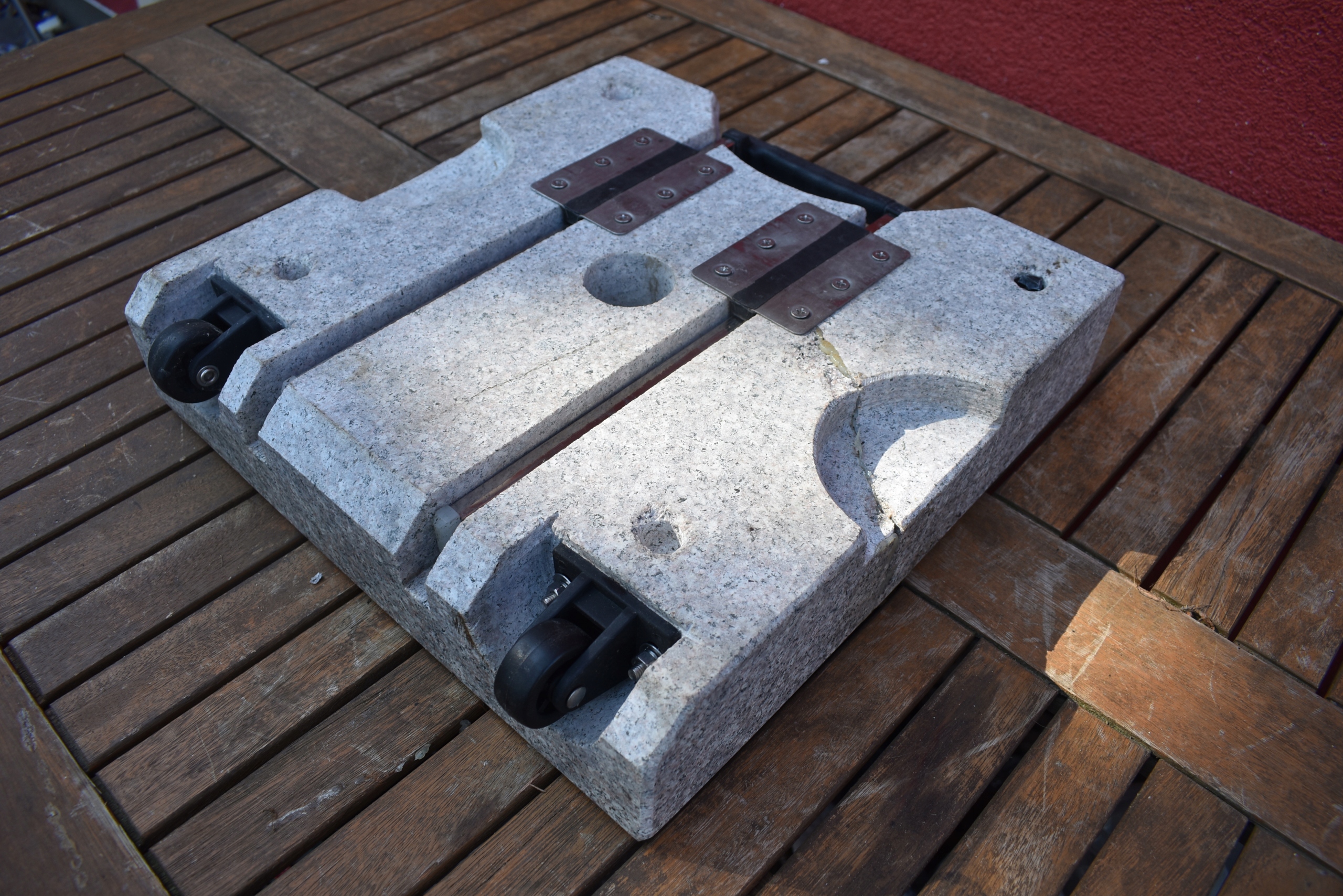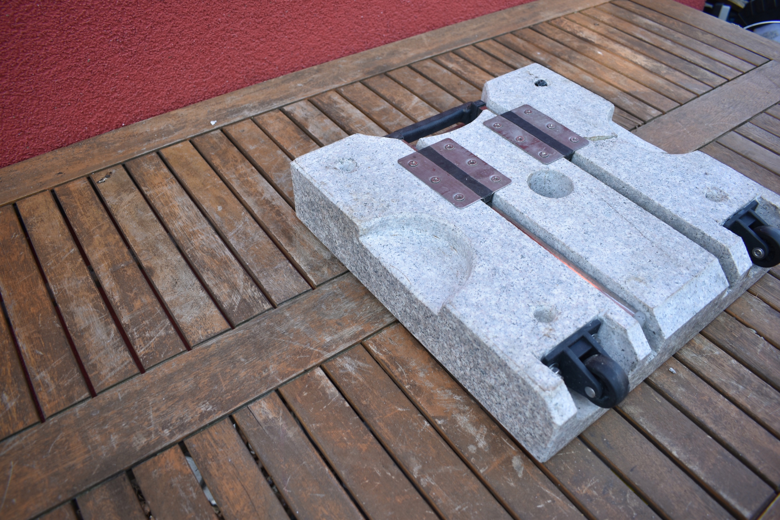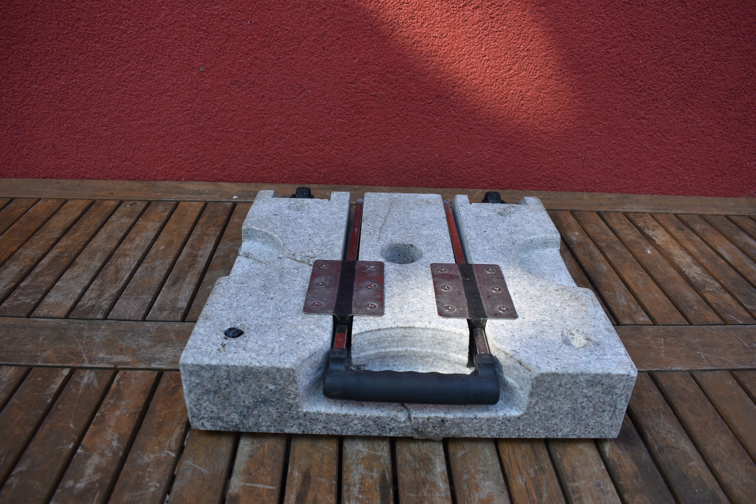 Суцільна гранітна основа з масою 28 кг, придатна для парасольок з діаметром до 1,8 метра. Трубка опорної трубки з нержавіючої сталі підходить для парасольових стрижнів діаметром Ø 2,5 / 3,2 / 3,8 / 4,8 см. З рукодільними порожнинами для ручки, дружніми для підлоги ноги перед втиранням та кріпленням гвинтів. Підставку легко переносити завдяки висувної ручки та колеса.
