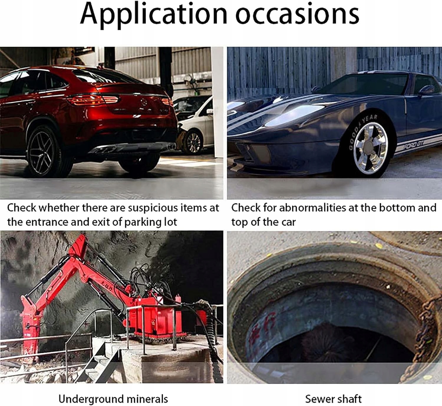 Легка перевірка інспекційного дзеркального транспортного засобу - це відмінний інструмент для перегляду днищів автомобілів машинних автобусів шкільних автобусних поїздів будівельного обладнання промислове обладнання та інші майже видимі райони. З світлодіодним світлом, озброєння інспекції оснащені світлодіодами, дуже зручними для пошуку або збору витоків тріщин у втрачених інструментах у темному або щільному місці. Регульована ручка телескопічного тримача дозволяє працівнику захисту легко перевіряти скрізь під транспортним засобом, не згинаючись або втрачати свою концентрацію на контрольному завданні. Легко в перенесенні цього компактного дзеркала пошуку може допомогти вам зберегти безпеку або носити їх як особисті предмети оператора. Його можна скласти в плоску форму, щоб носити рівномірну або рівномірну кишеню або мішок. Широкий спектр застосувань Типові застосування дзеркал для інспекції включають захист від паркувальних захисту.
