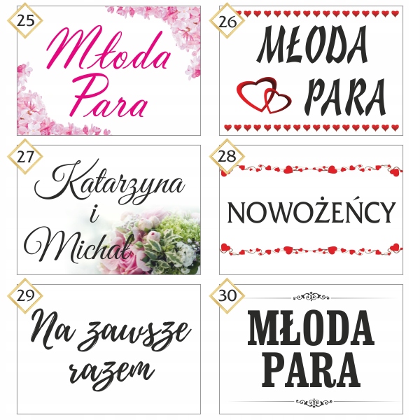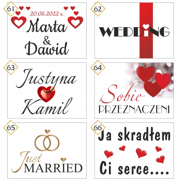 Весільні щити з іменами нареченого і нареченої (та ін.) з розмірами квадратної дошки для автомобіля. Зроблено цифровим способом, тому відбиток не розмивається навіть під час найсильнішої зливи. Крім того, на зворотному боці дошки є двосторонній скотч для зручного кріплення. Розмір дошки: 305 х 214 мм. У кожному дизайні є можливість змінити шрифт, додати індивідуальний напис, змінити колір шрифту. Якщо у вас є власний дизайн, ми з радістю його вам надрукуємо, це не впливає на додаткові витрати. Ми можемо підготувати індивідуальний проект БЕЗКОШТОВНО. Якщо є запитання, пишіть. ЦІНА ВКАЗАНА ЗА 1 ПК