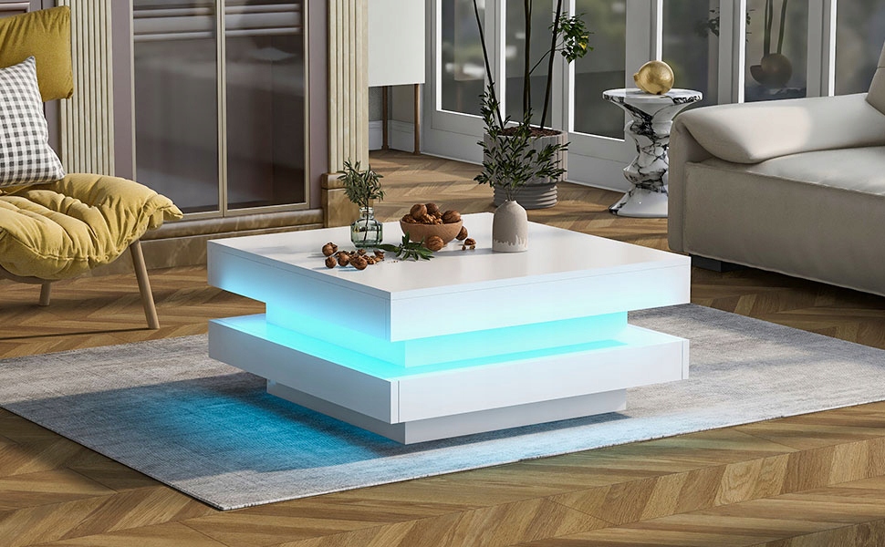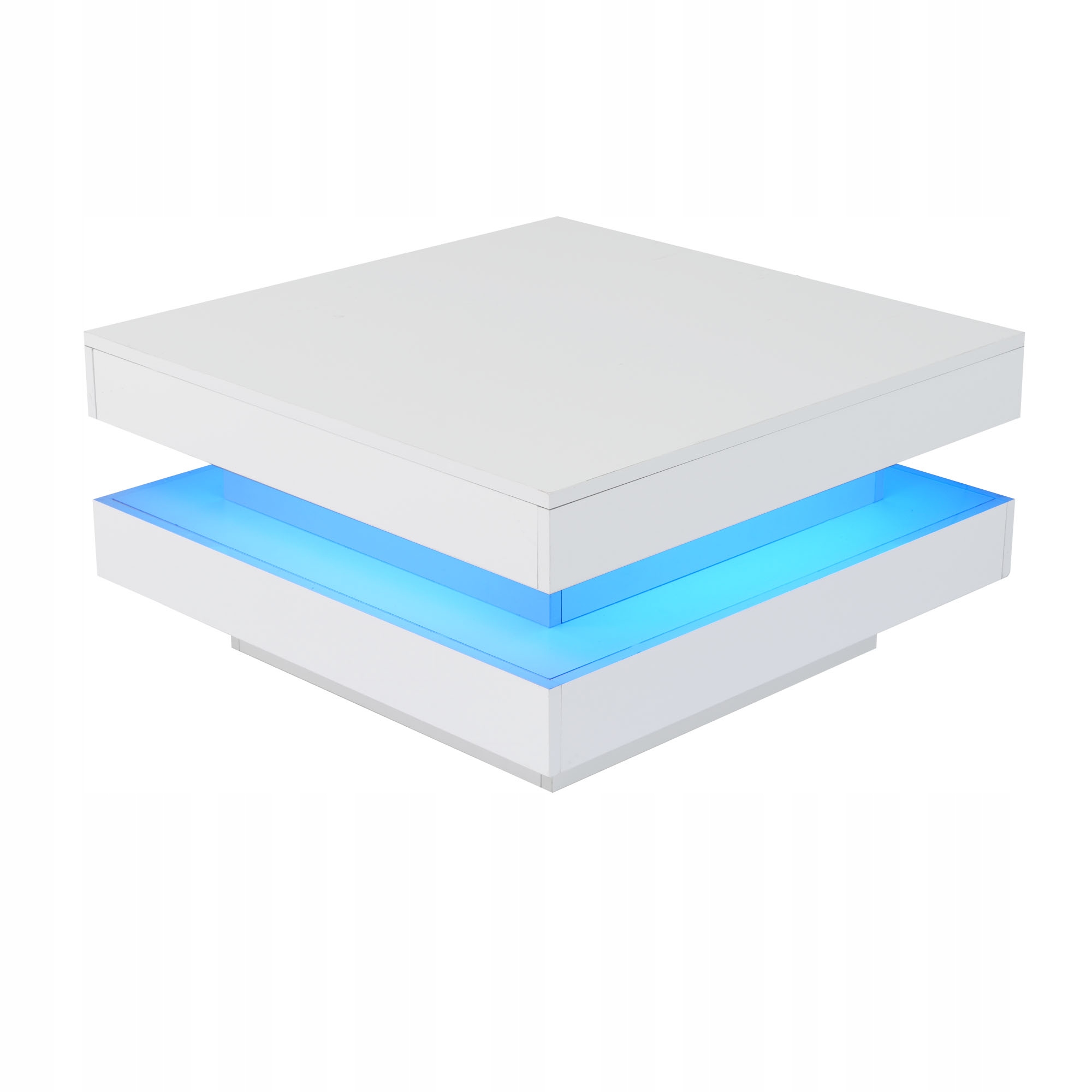 - Цей квадратний журнальний столик з розмірами 70x70x36 см оснащений 16-кольоровим світлодіодним освітленням у центральній частині. Цей унікальний проект додасть до вашої кімнати футуристичний акцент і створить затишну атмосферу. кімната.