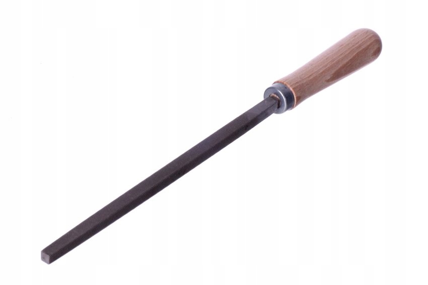 Напівгладка напилка, яка використовується для зачищення металевих поверхонь, оздоблена профільованою дерев’яною ручкою.