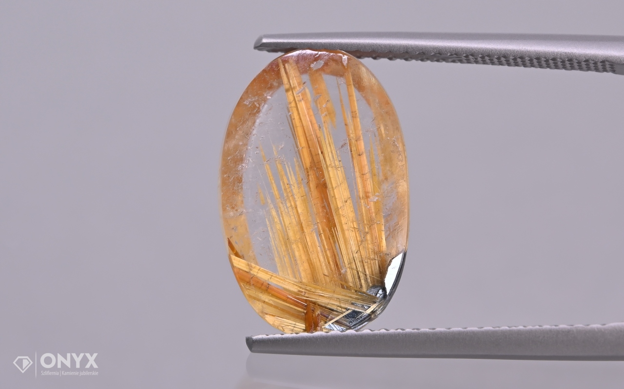 Тип каменю: Кварц з рутил/кварцолором: безбарвний із золотими маршрутними нитками Розміри: 15,5х10 мм товщиною: 3,5 мм 4 Це безбарвний камінь, іноді він може бути трохи хмарно. Його характерною особливістю є інклюзії Rutyl. Зазвичай він походить від магматичних скель, пегматитів або осадових скель. Мінерал - один з найбільш поширених сортів кварцу.