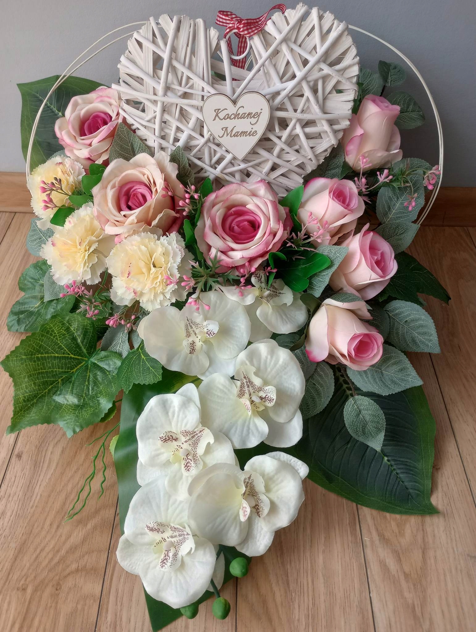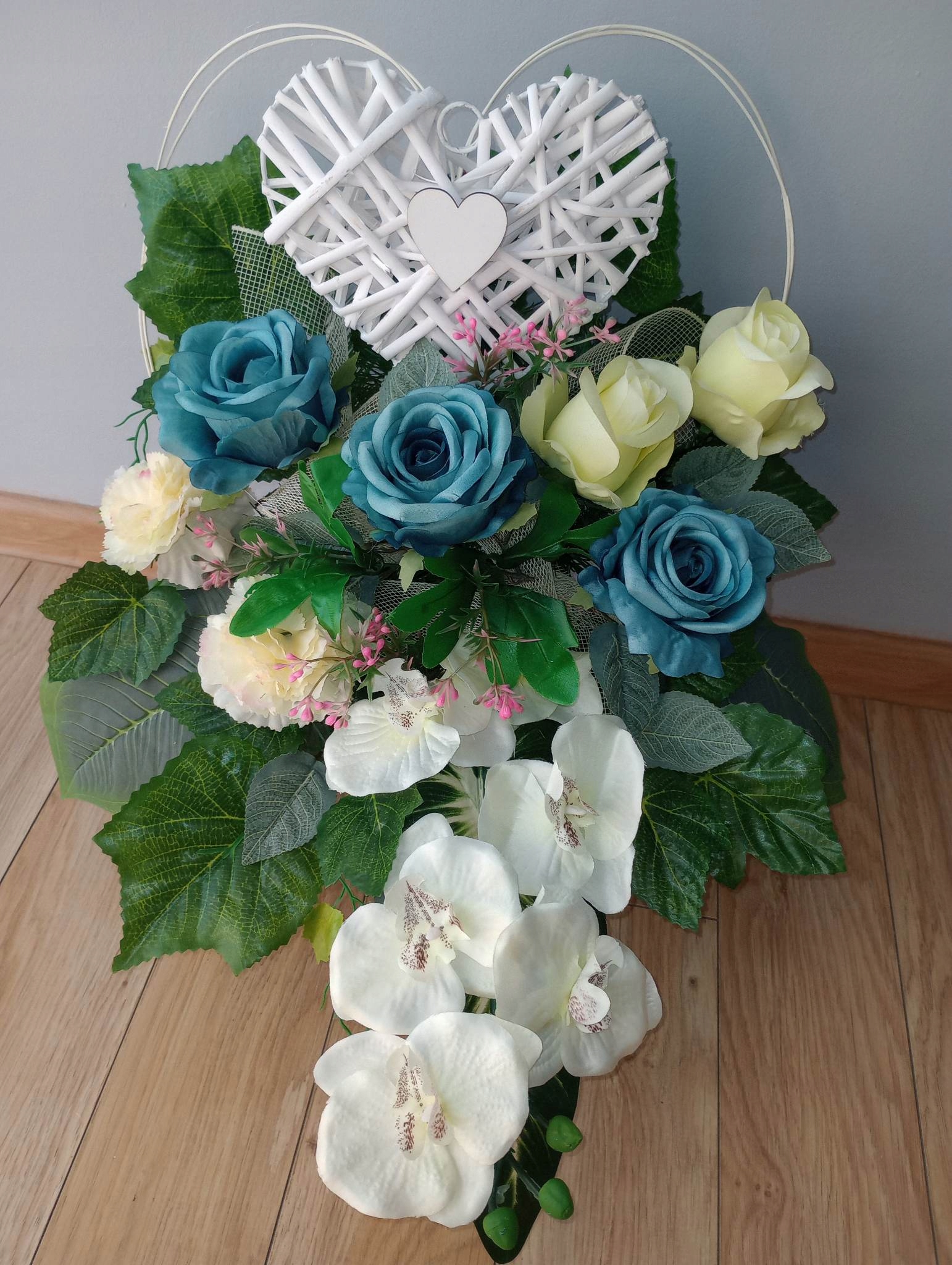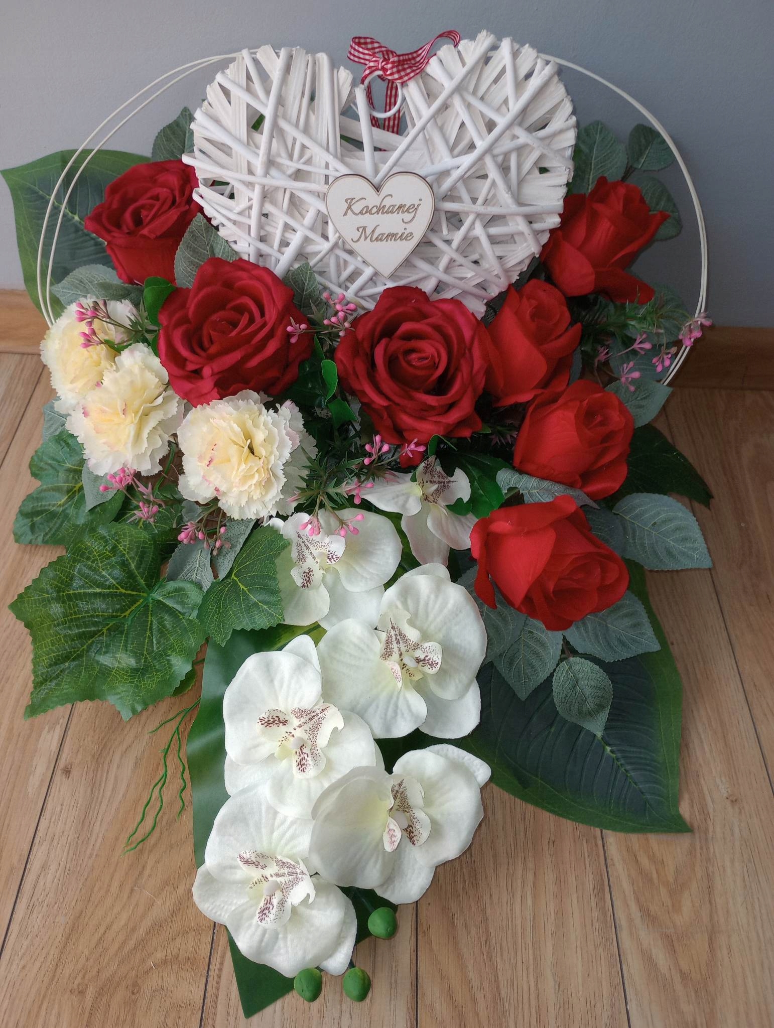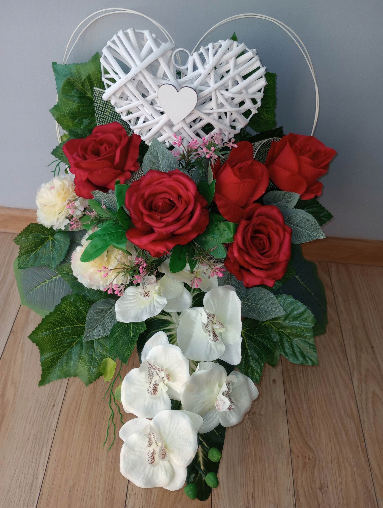 Штучна композиція (так званий вінок, ікебана) З ПЛЕТЕНИМ СЕРЦЕМ виготовляється зі штучної ялинки в пластиковий горщик, який надає йому стійкості.