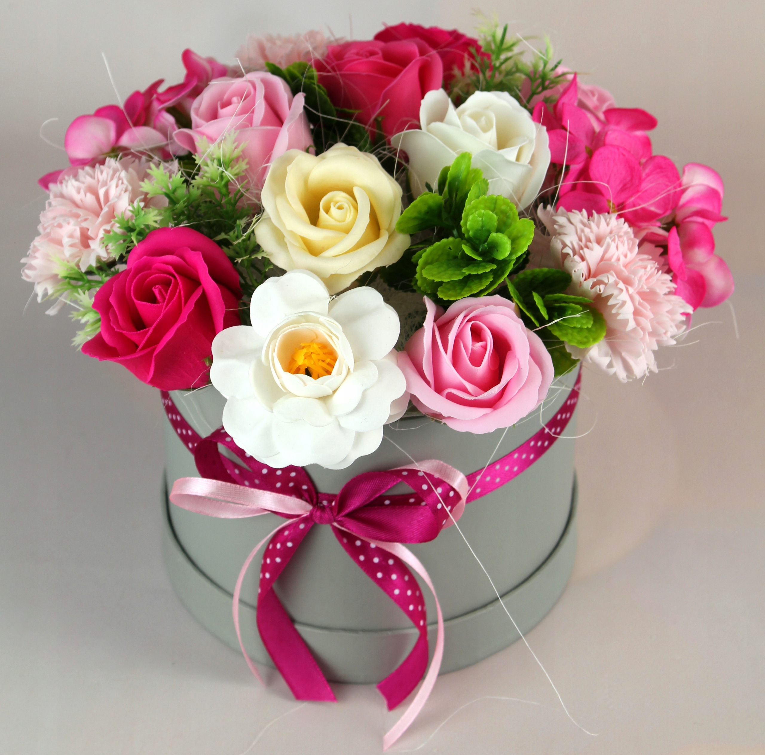 Букет виготовлений у квітковій коробці зі стрічкою, якісними мильними квітами та штучними аксесуарами.