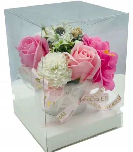 Квіткова коробка з мила в пластиковому чохлі. Букет упакований в прозору коробку.