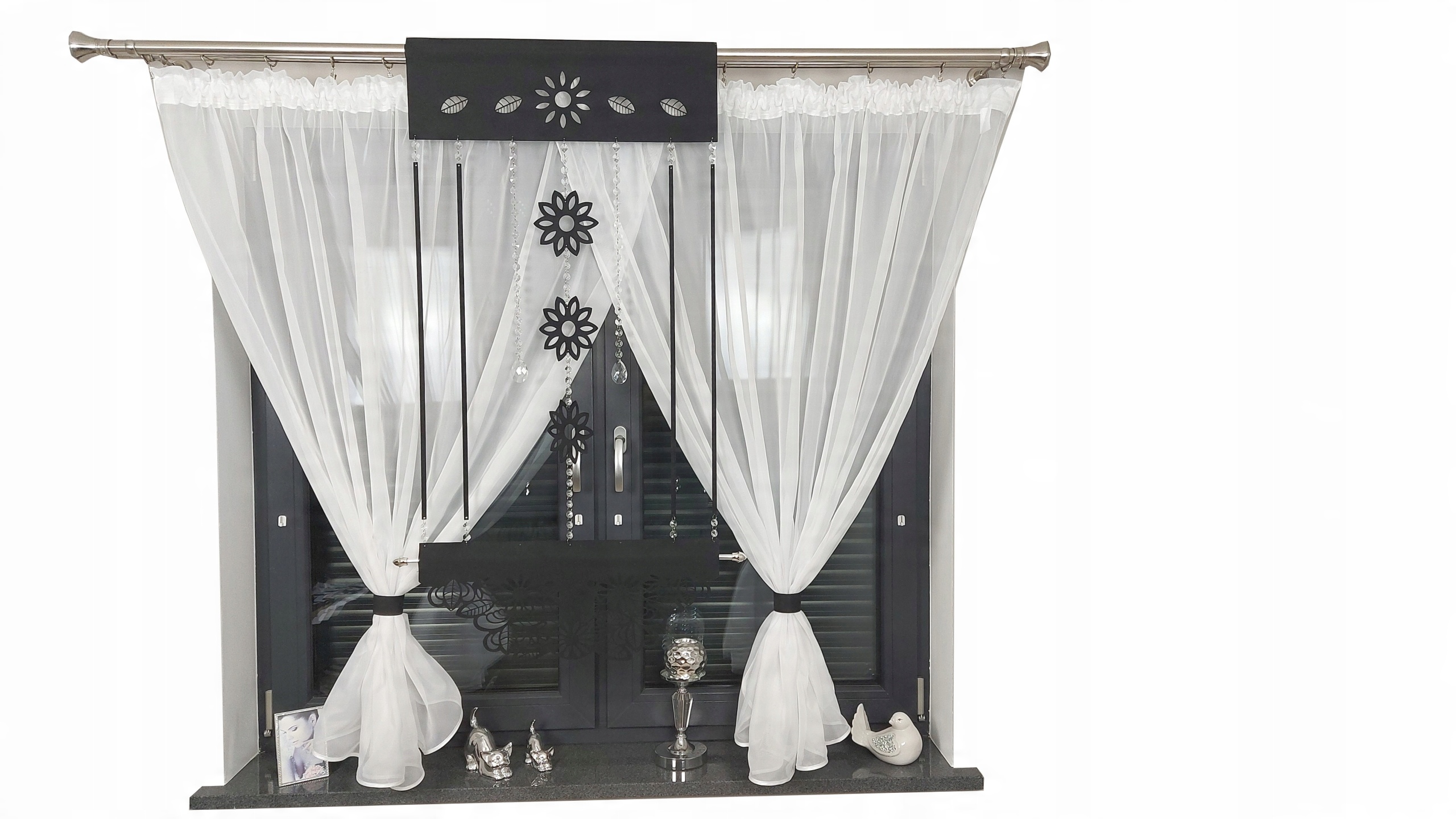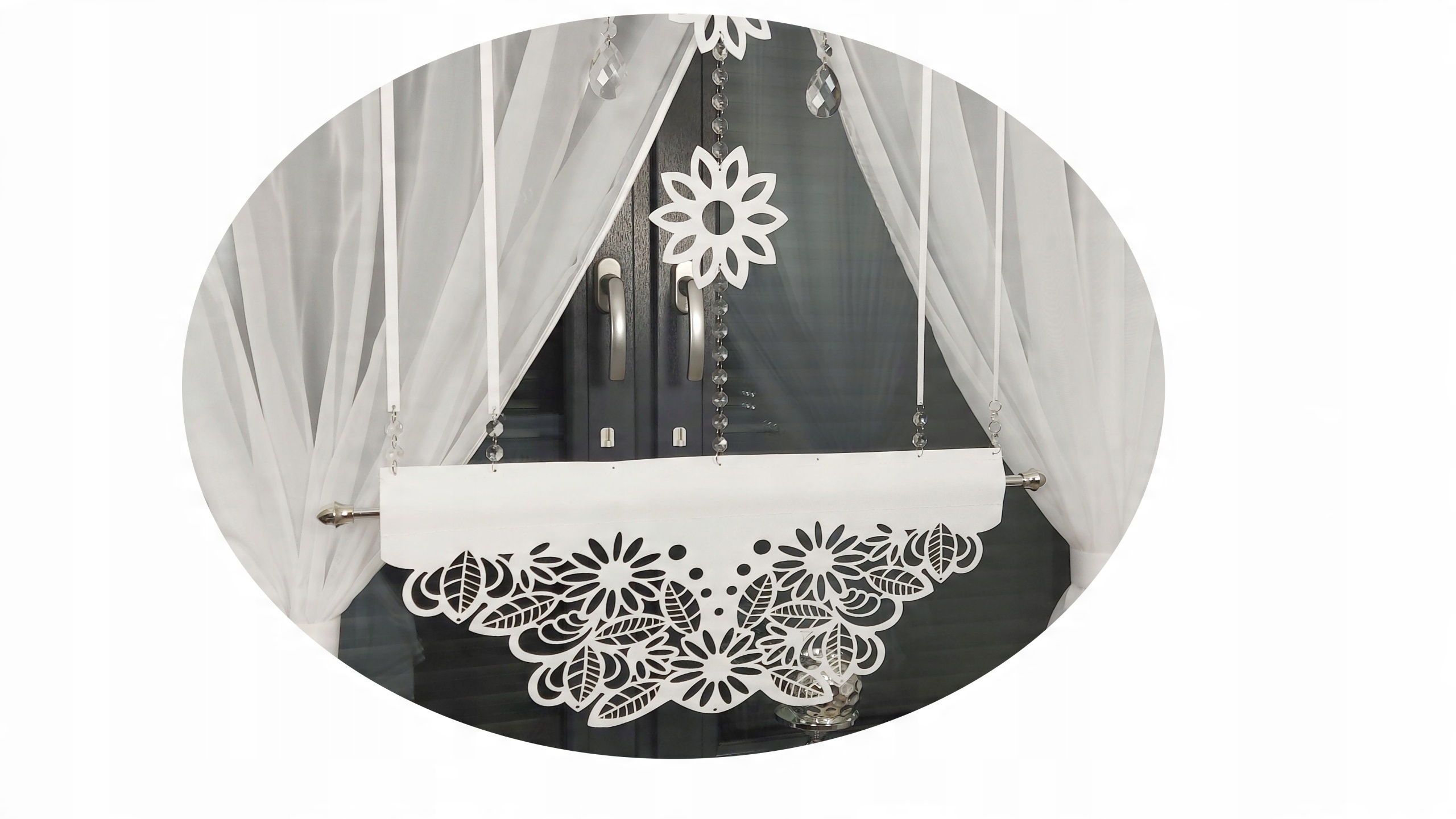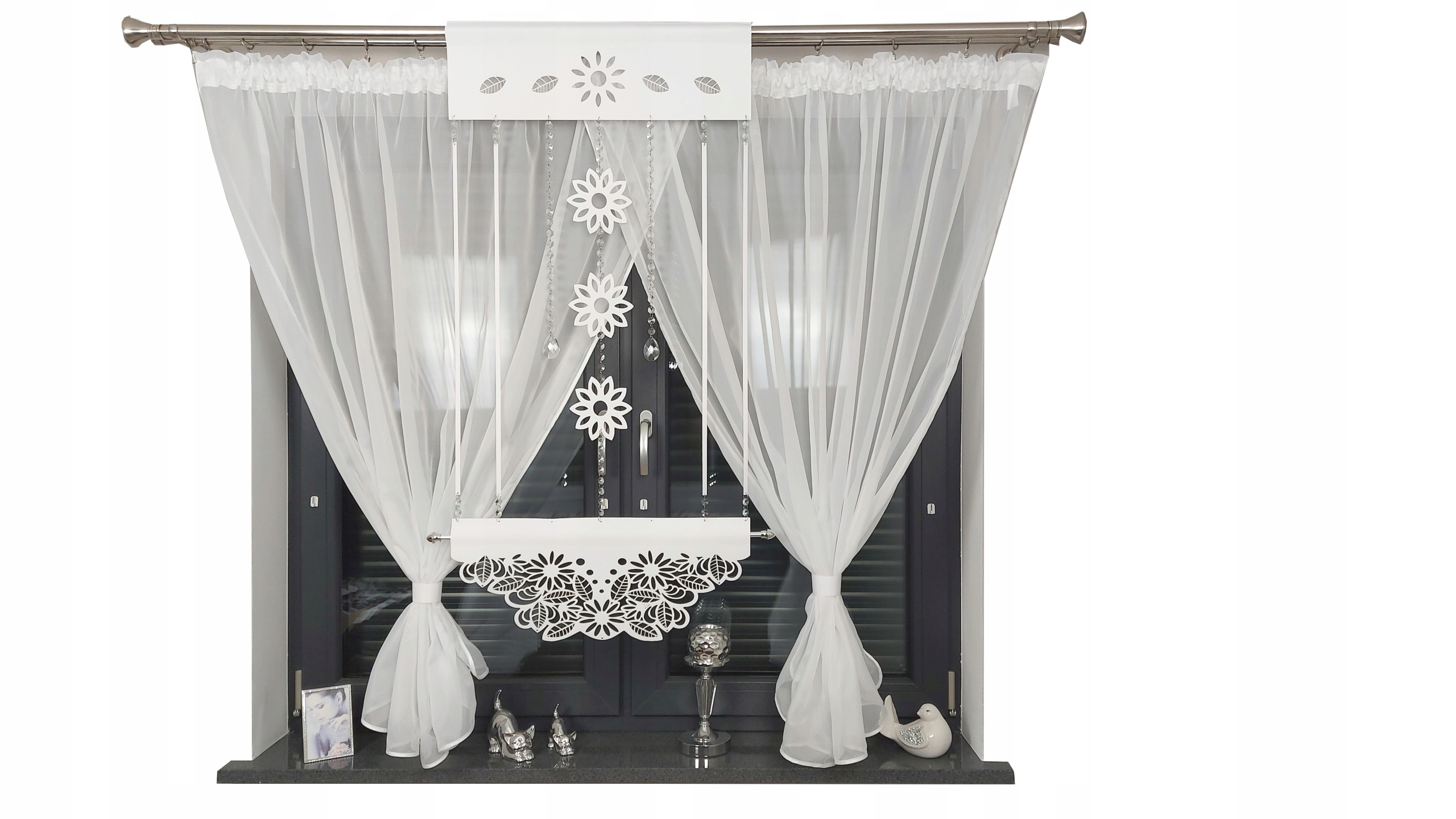 варіант з додатково пришитним рибальською стрічкою, пришитами, що дозволяє шторовій пруці, додатково оплачується PLN 5, можна придбати на іншому аукціоні. , Панель відкритої роботи, закінчена гірляндами та скляними кристалами.