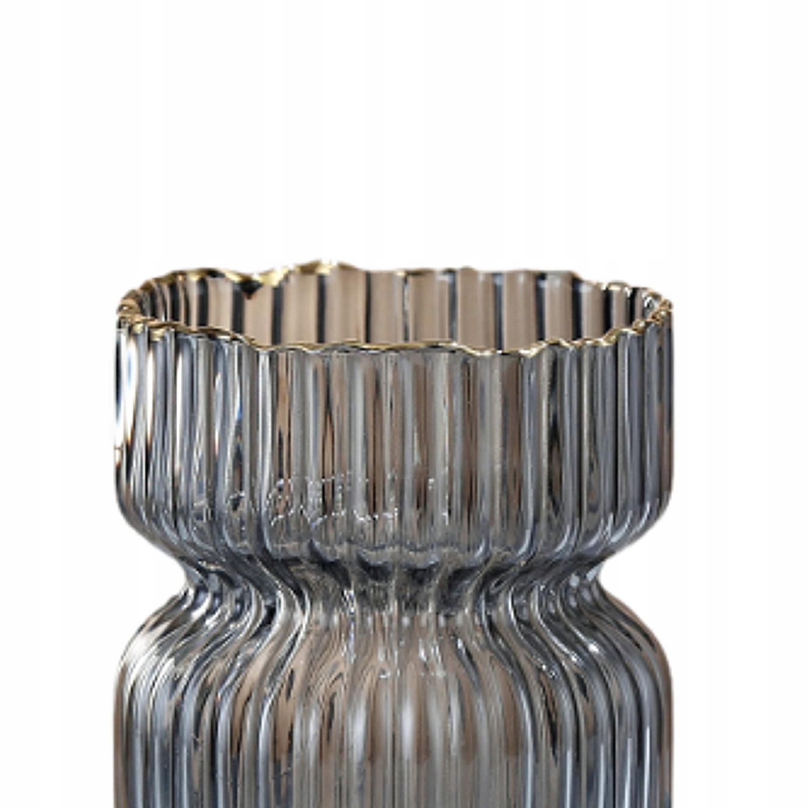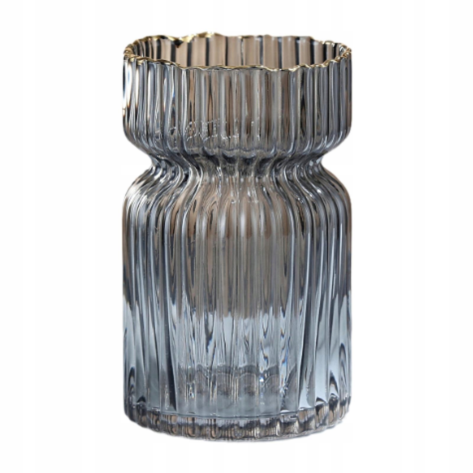 [Матеріал]Ця вертикальна ваза з вузьким поясом виготовлена зі скла, із золотистим краєм горловини пляшки та ніжною текстурою.