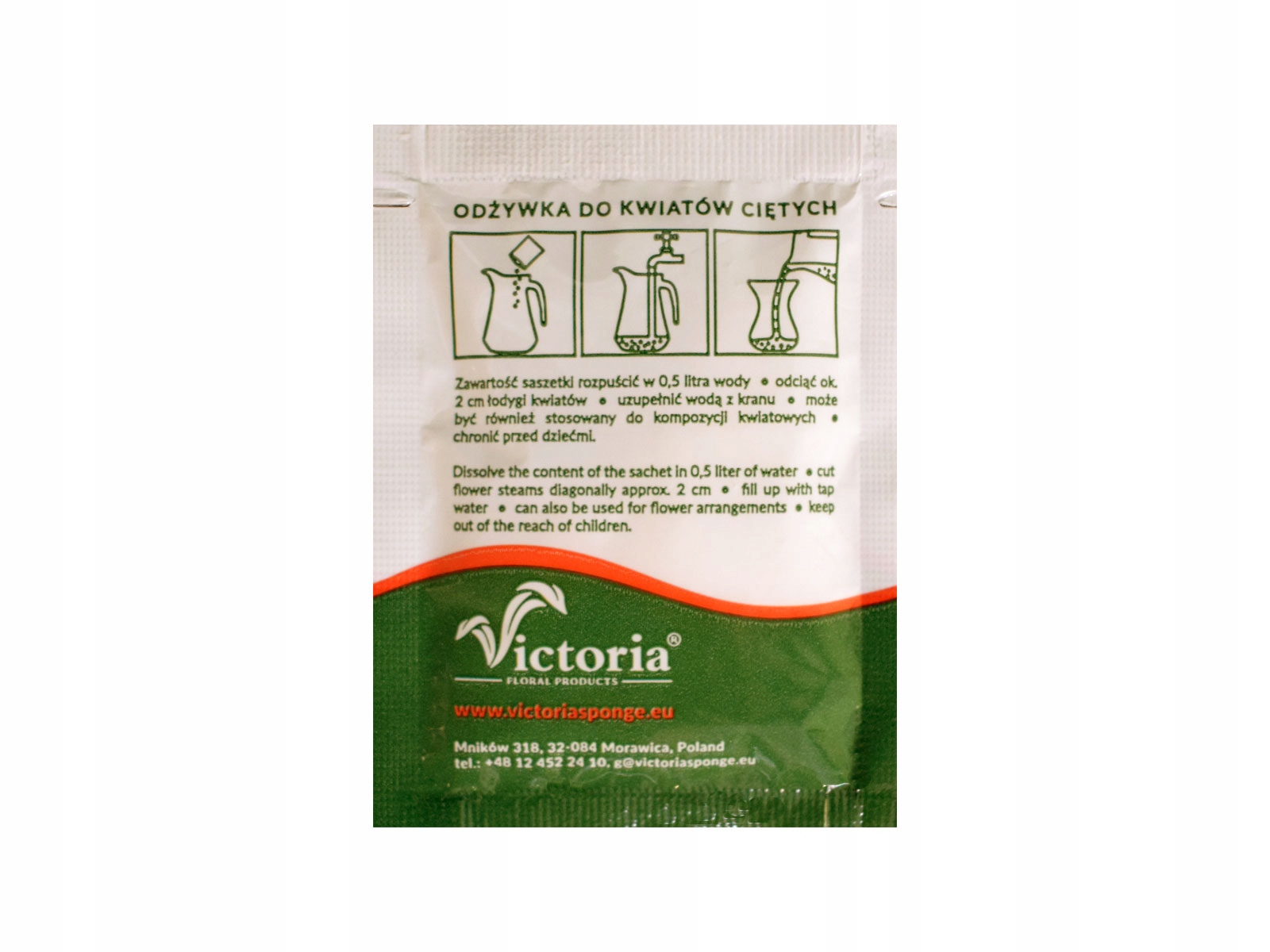 Victoria Floral Products - універсальний кондиціонер для свіжозрізаних квітів. Кондиціонер поміщений в маленькі, зручні у використанні пакетики. Вміст одного пакетика розчинити в 0,5 л води. Кондиціонер має ЧИСТУ формулу - яка забезпечує чисту воду, без відкладень.