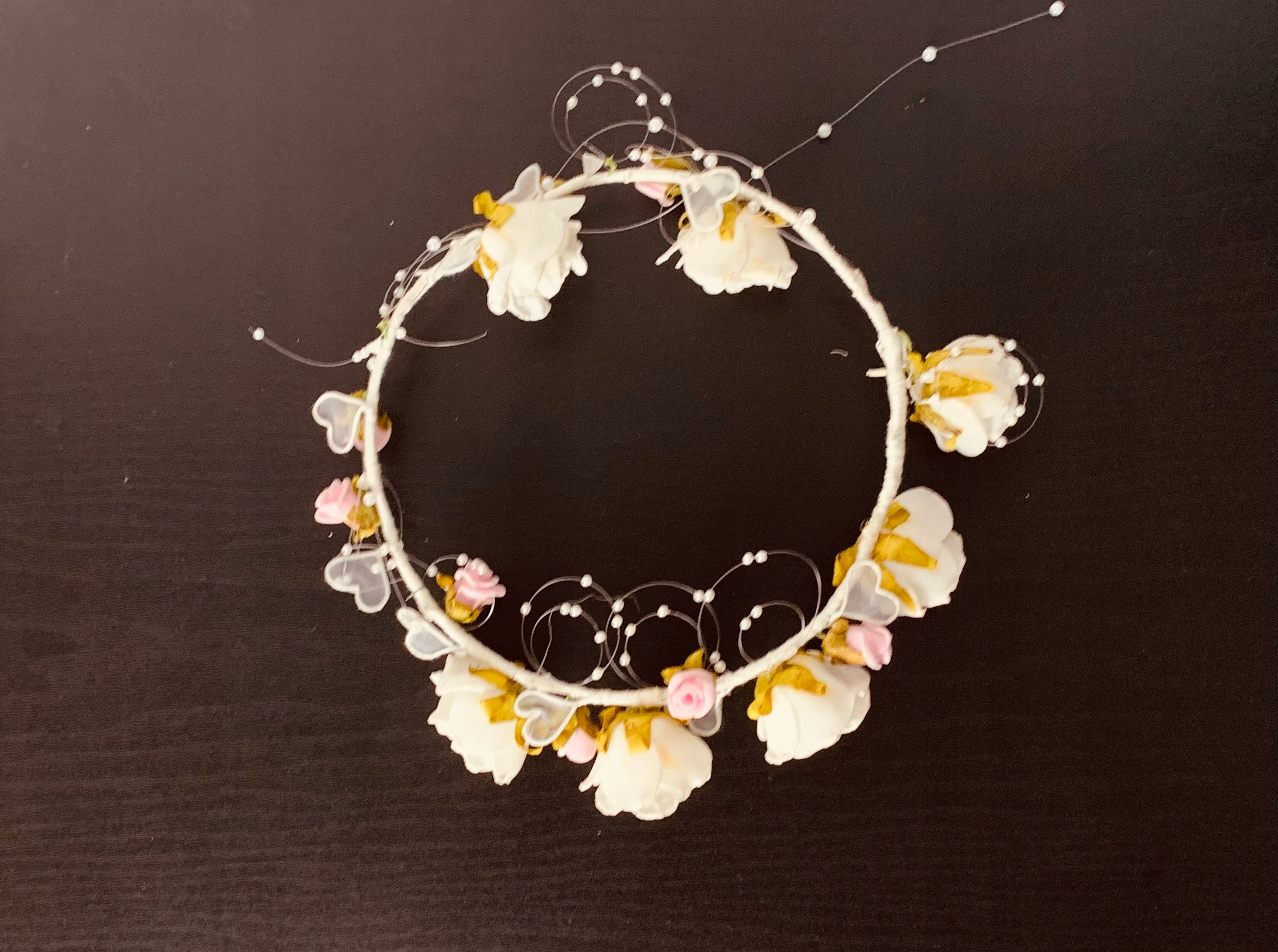 - Поплавковий склад: вінок прикрашений двома типами квітів: більшими, повними, розвиненими білими трояндами , виготовленими з ніжної піни або утвореним матеріалом, з тонко позначеними, жовтуватою/золотими стрижнями в серці квітки, і меншими, чарівними пончиками троянд у кольорі пастеля, а також від піни. Декоративні - серця: надзвичайно милі та оригінальні деталі невеликі, напівпрозорі, білі/кремові тюльні серця , пришиті або прикріплені до основи, додаючи композицію символічного виміру та дівочої благодаті. Вони перетворюють делікатні, майже невидимі квіткові вени / дроти , на яких численні, маленькі, білі / кремові, мерехтливі перли / намистини з перловим сяйвом вбудовані . Ці перли, здається, піднімаються навколо квітів, створюючи ефект зіркового пилу або краплі роси, додаючи всю легкість і магічне сяйво. Деякі вени завершені поодинокими, більшими перлами. 4