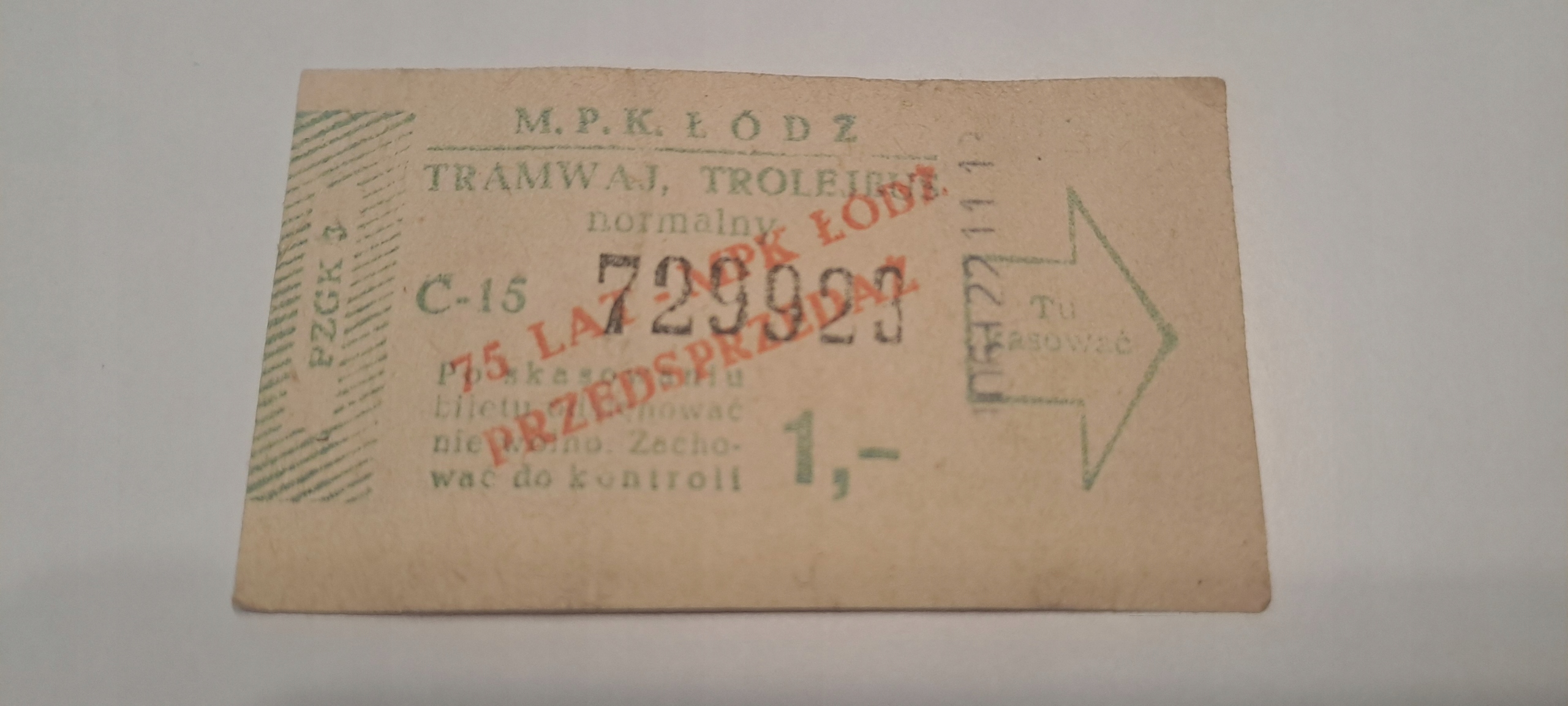 КВИТОК 75 РОКІВ MPK ŁÓDŹ ПОПЕРЕДНИЙ ПРОДАЖ 1 PLN (C-15) ТРАМВАЙ ТРОЛЕЙБУС PRL