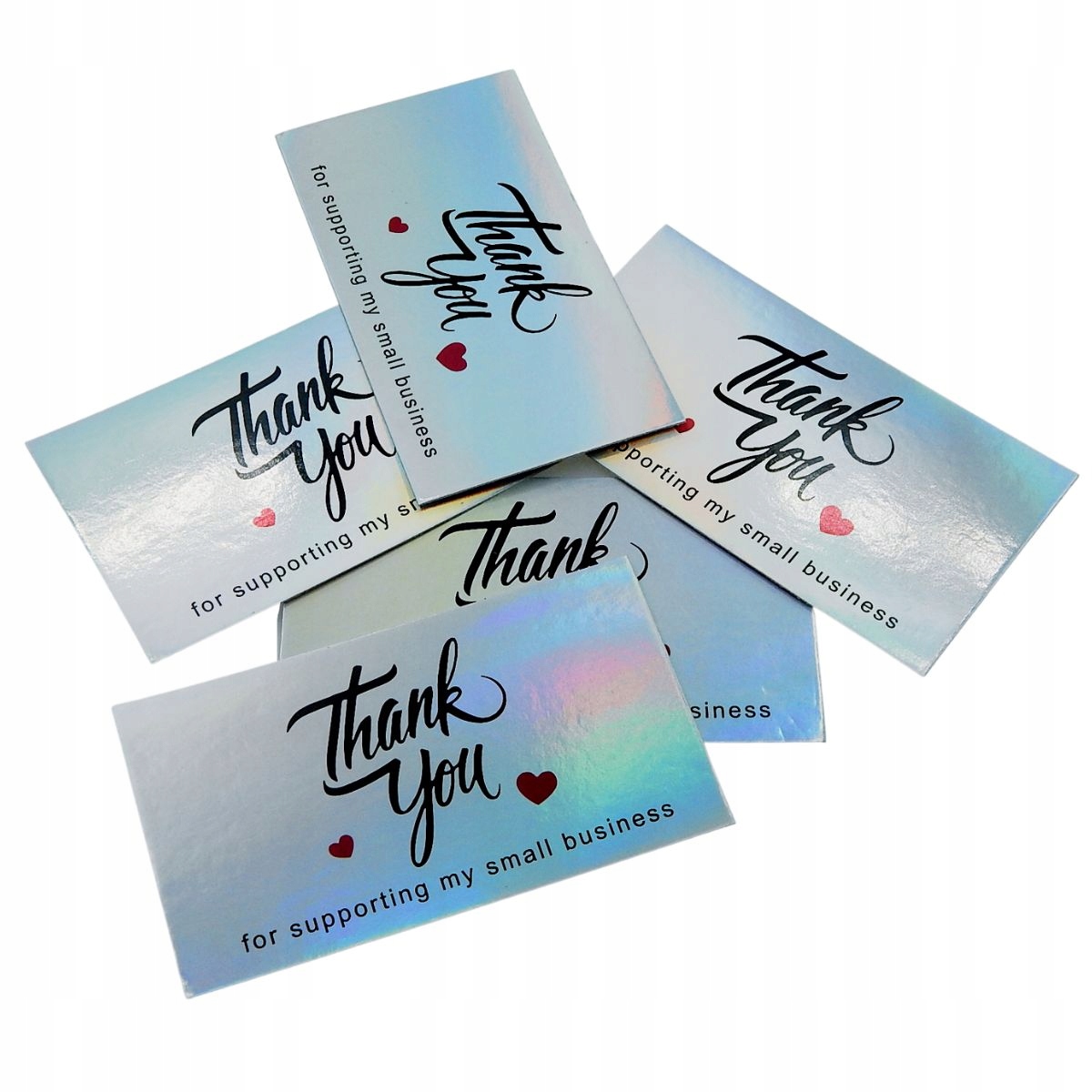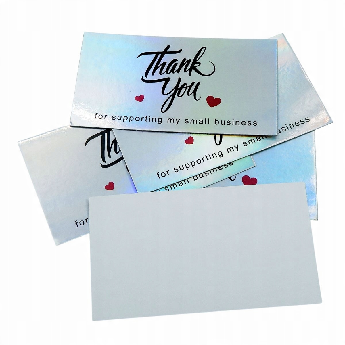 Набір із 5 срібних візитних карток із написом Дякуємо за підтримку Мій малий бізнес. вітрина, покрита мерехтливою фольгою з чорним принтом, виготовленим з декоративного шрифту. На Зворотний простір для штампу, рукописного напису або друку.