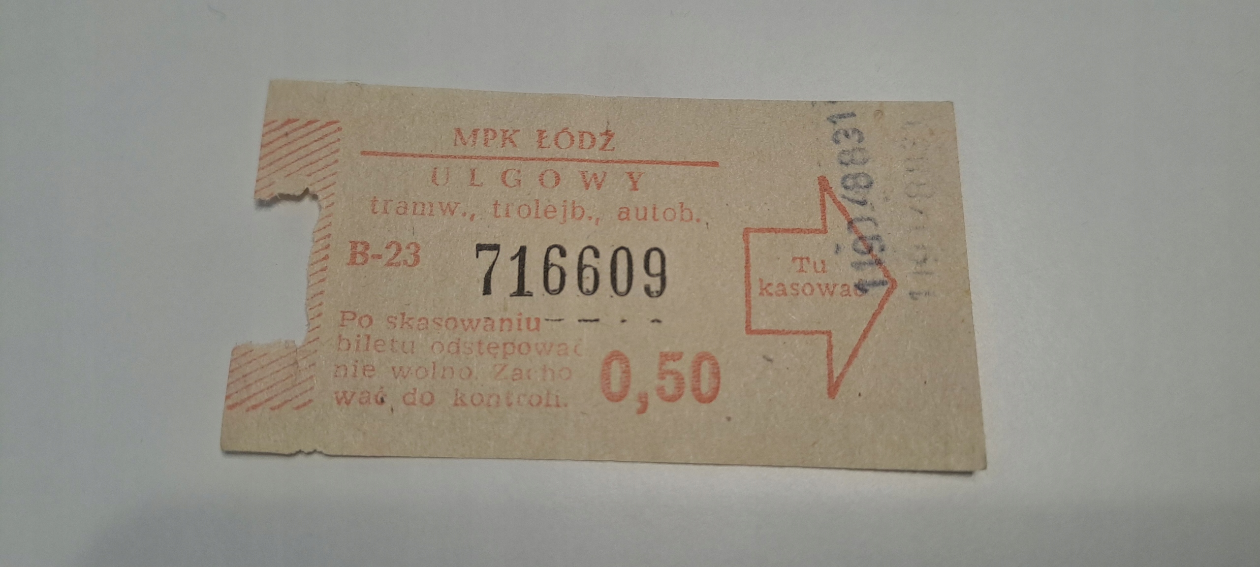 КВИТОК MPK ŁÓDŹ 0,50 PLN (B-23) ТРАМВАЙ ТРОЛЕЙБУС АВТОБУС PRL
