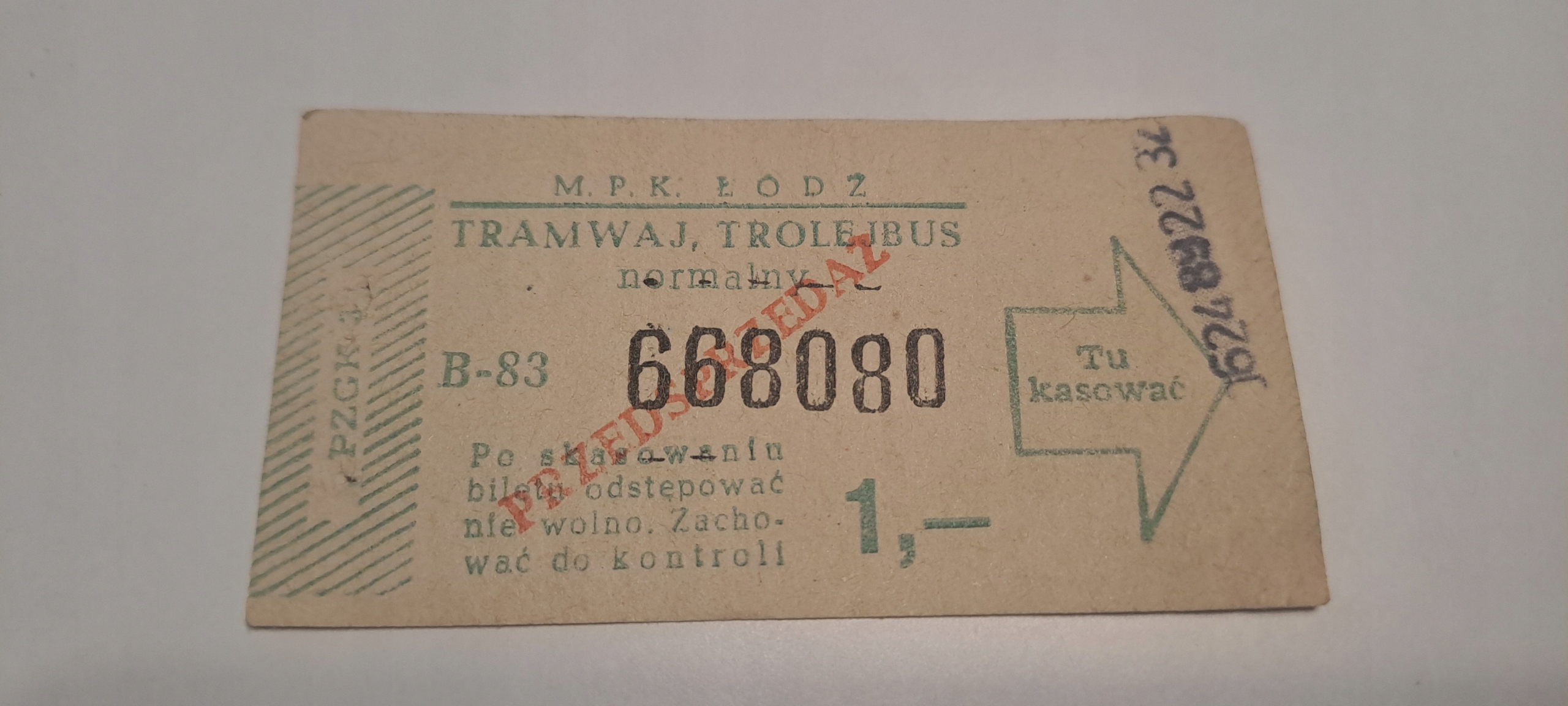 КВИТОК MPK ŁÓDŹ ПОПЕРЕДНІЙ ПРОДАЖ 1 PLN (B-83) ТРАМВАЙ ТРОЛЕЙБУС PRL5