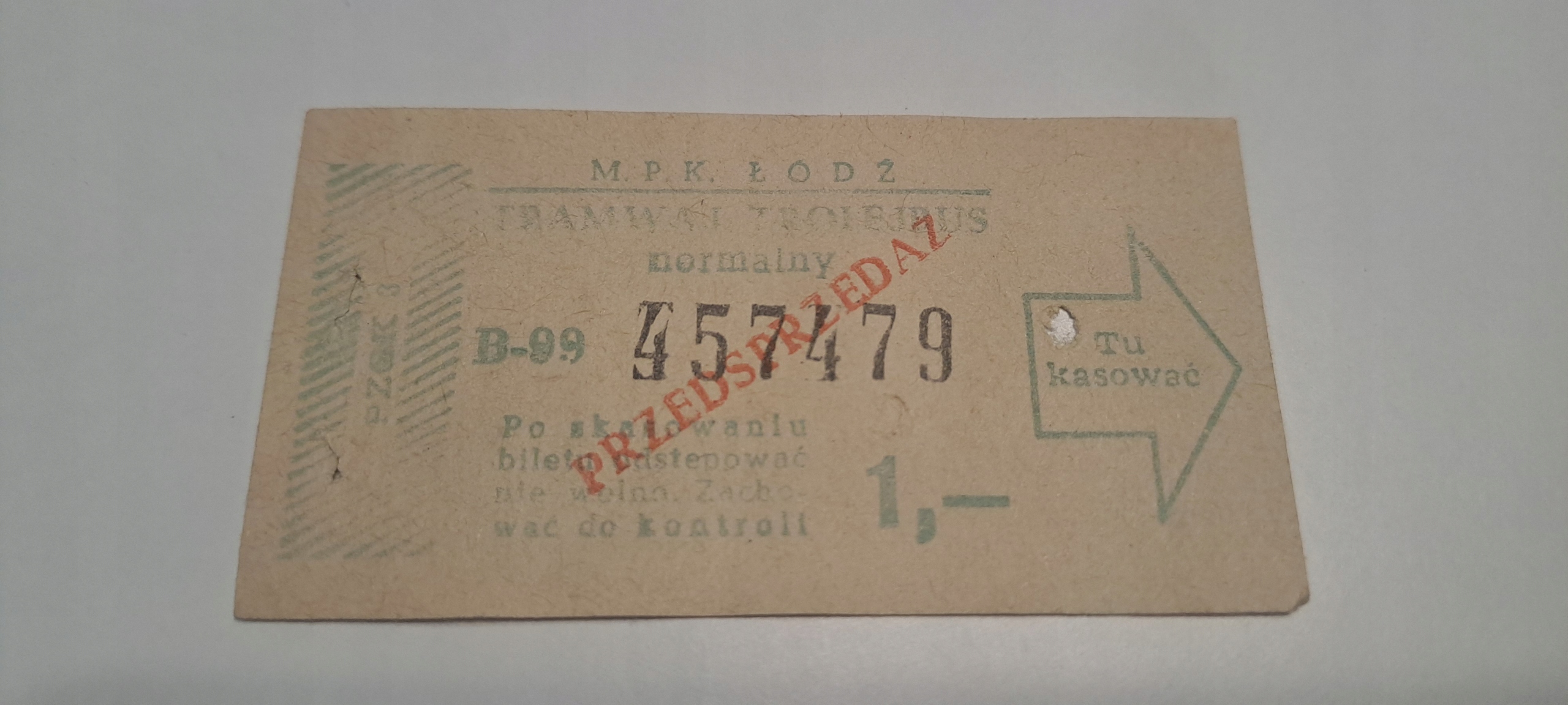 КВИТОК MPK ŁÓDŹ ПОПЕРЕДНІЙ ПРОДАЖ 1 PLN (B-99) ТРАМВАЙ ТРОЛЕЙБУС PRL5