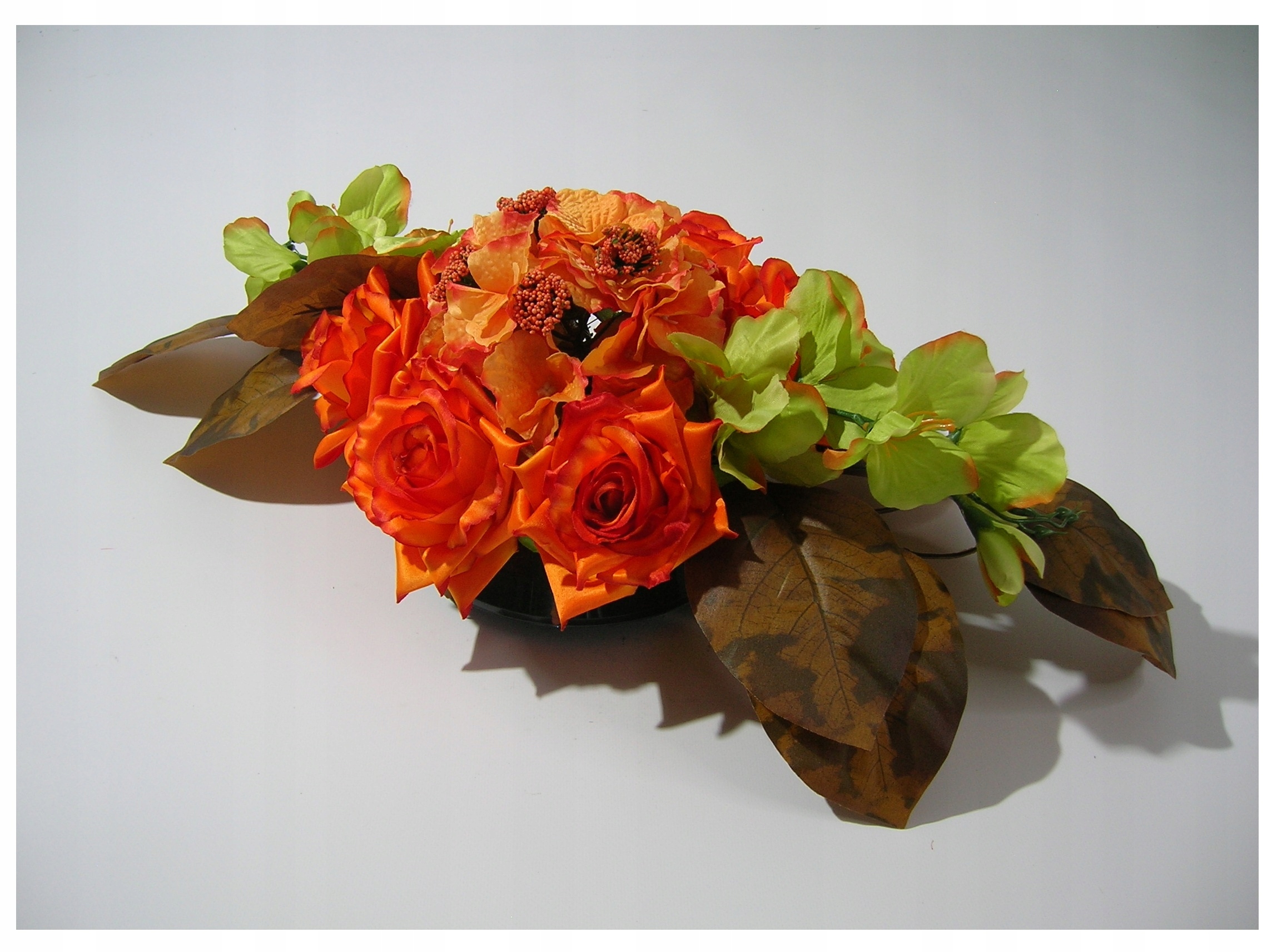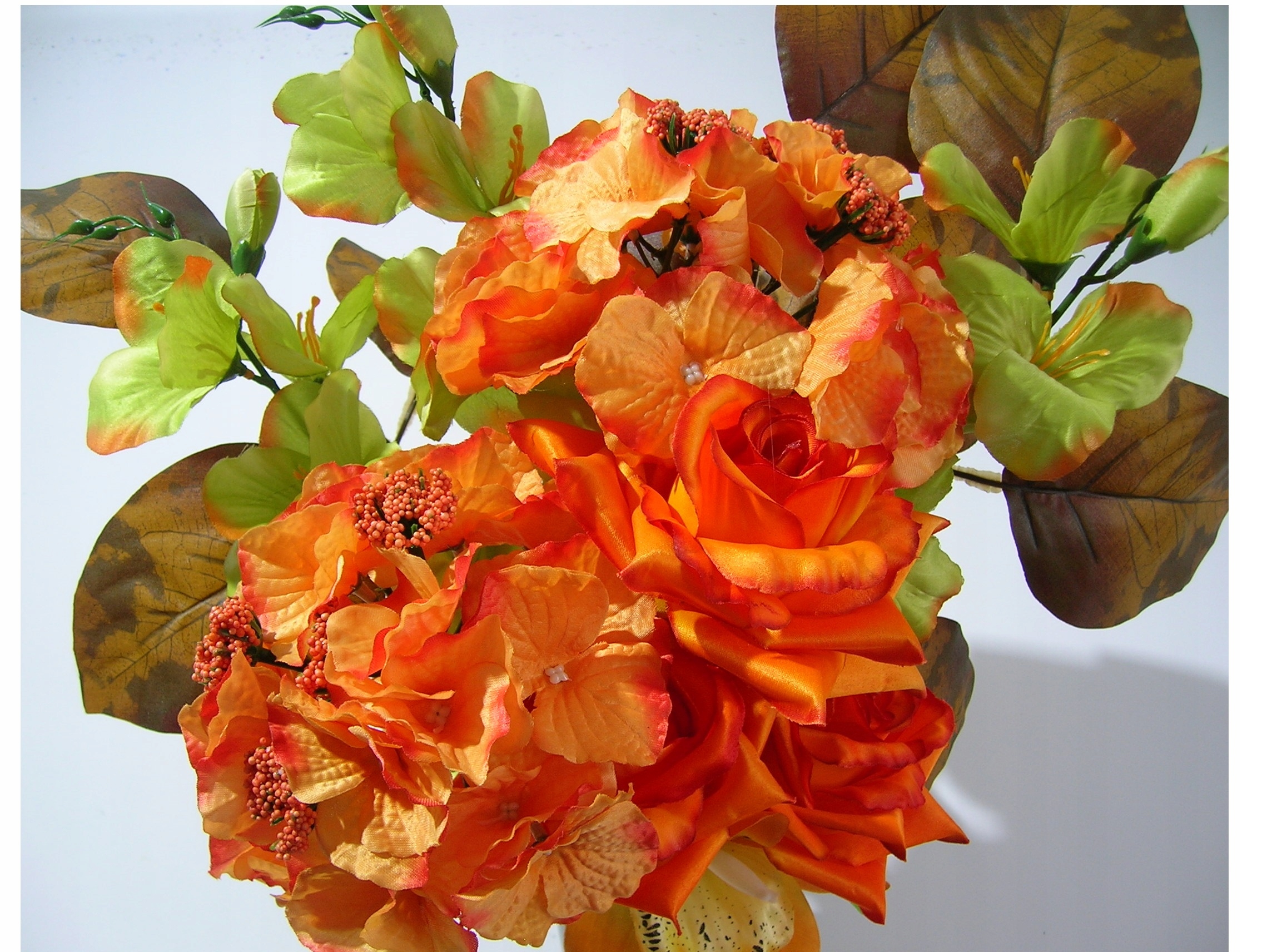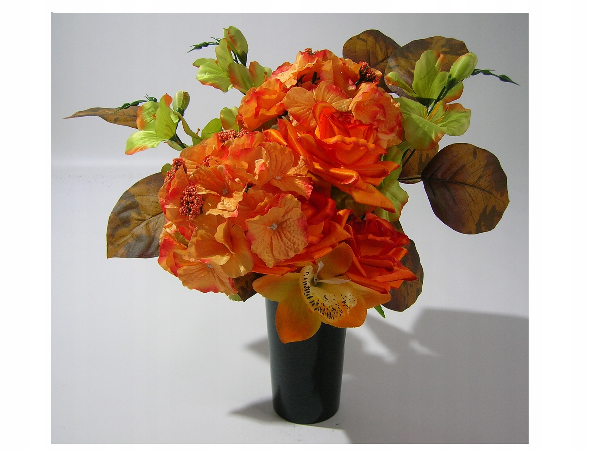 Предметом пропозиції є набір, до складу якого входить букет (вкладка) для пляшка і прикраса для пам'ятника. Набір складається зі штучних квітів помаранчевих і зелених відтінків: гладіолусів, троянд і гортензій. Квіти красиво поєднуються з листям у відтінках коричневого. Дуже цікаві кольори квітів роблять набір гарною прикрасою могили в будь-який час року. Тут треба зазначити, що квіти на могилу повинні бути її прикрасою не тільки в День помиятої. Тому я представляю сучасний набір, який тепер повинен бути прикрасою могили наших близьких.