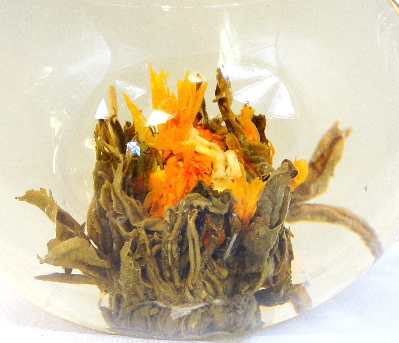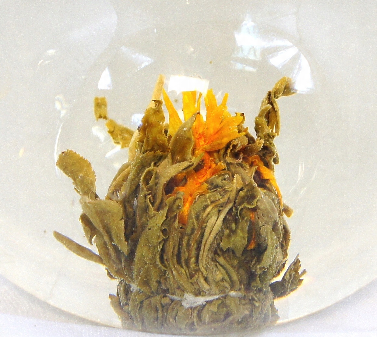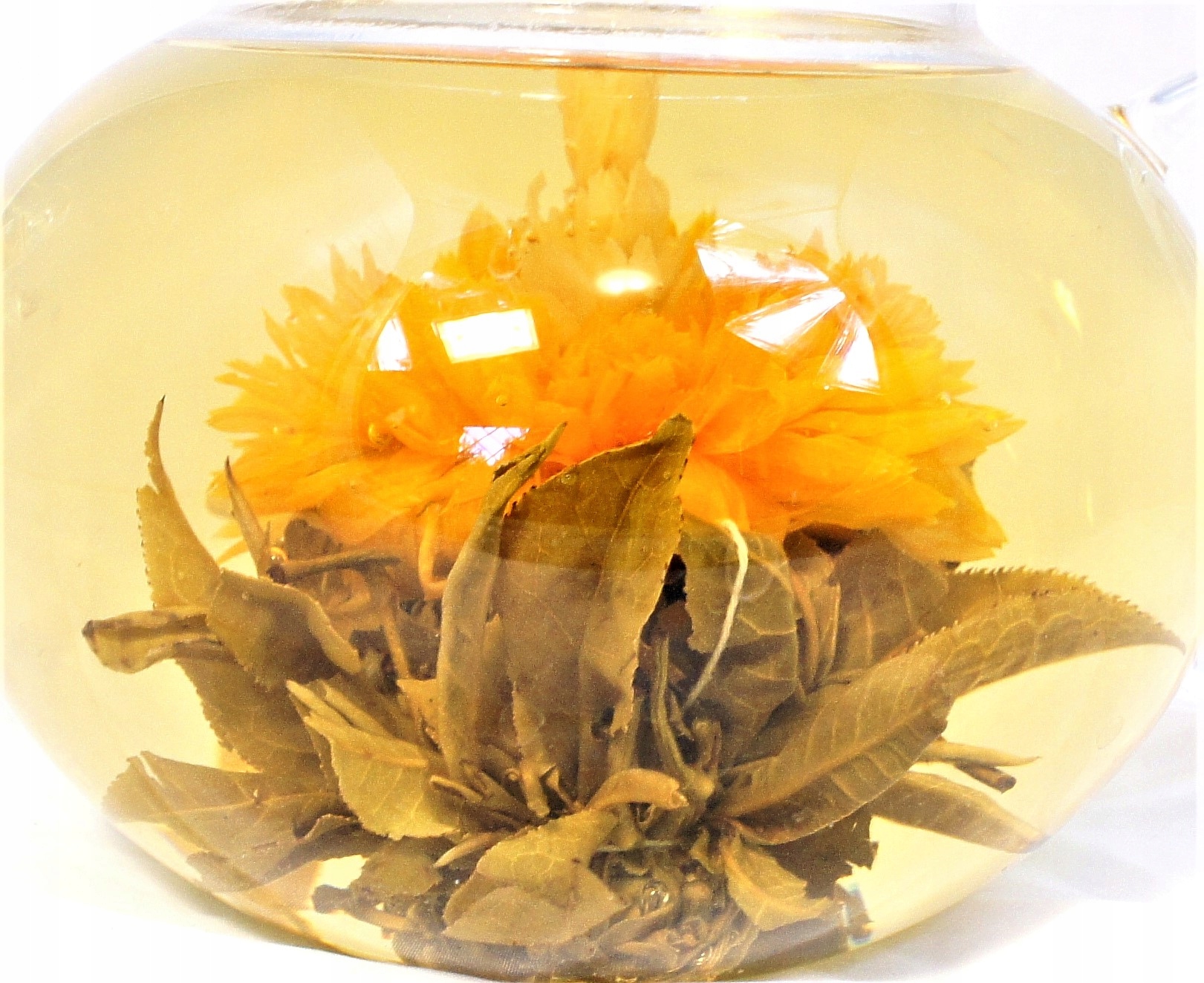 Відмінна якість, ручний чай на основі білого листового чаю. Білий і зелений чай, квітучий з Китаю, гарантує чудовий, ніжний смак з цікавою ноткою та надзвичайними естетичними враженнями. Наливаючись водою, зелено-сріблясті листочки непоказної кулі повільно розкриваються, випускаючи зсередини прекрасну композицію з квітів чорнобривців і жасмину. Настій має світло-жовтий колір і відмінний, дуже тонкий смак з ледь помітною ноткою жасмину, а також широкі оздоровчі властивості. В упаковці 100 г міститься 12-14 чайних кульок. Упаковані в пакети Eco, Alu або OPP. На інших аукціонах цей чай доступний в упаковках: банках, декоративних коробках, пакетах. Ми рекомендуємо