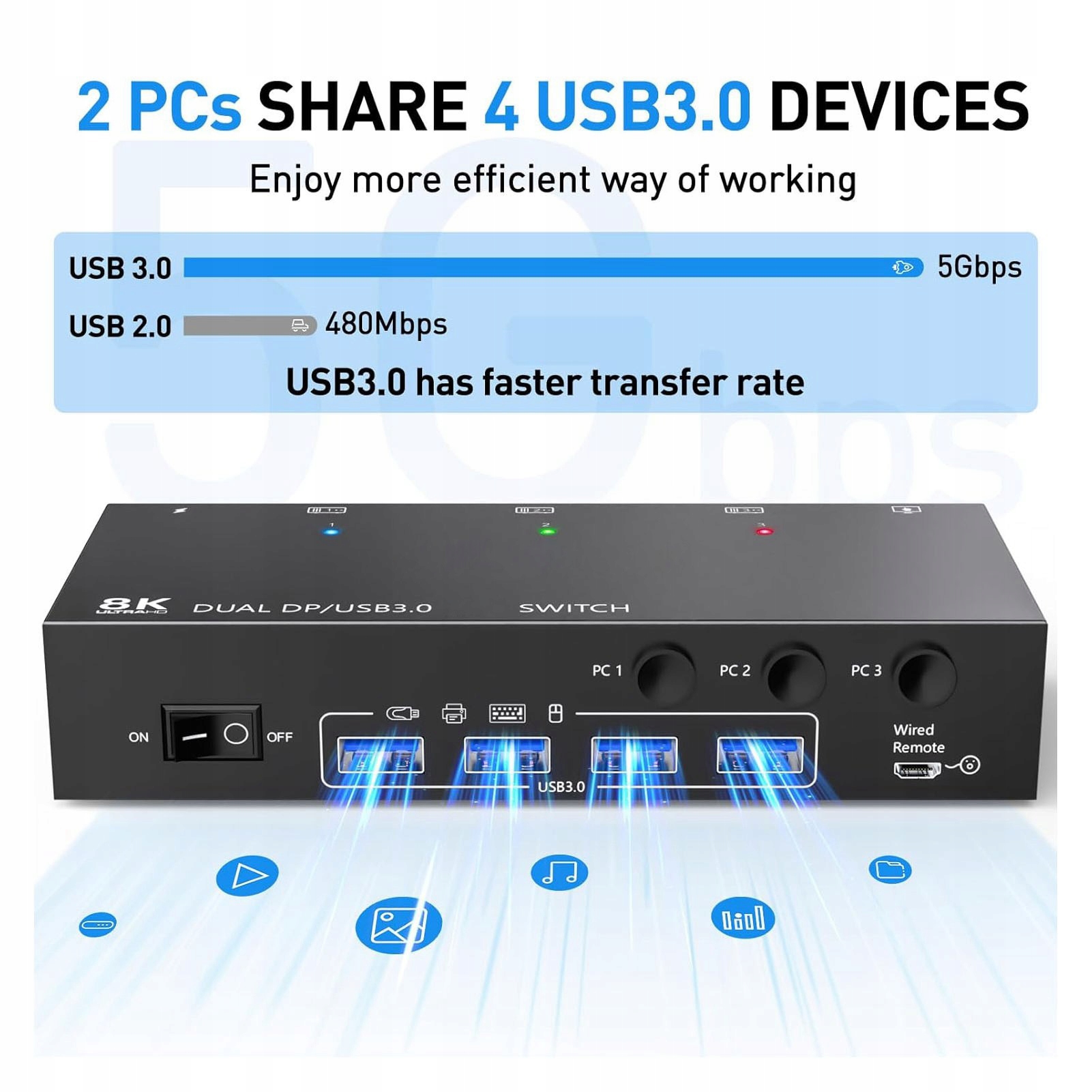 1. 3 КОМП'ЮТЕРИ 2 Відображення: Цей 2-кратний перемикач KVM можна керувати 3 комп'ютерами або ноутбуками, використовуючи лише один провідний набір або бездротову клавіатуру миші, приготування 4 пристроїв USB 3.0 та 2 дисплеї. Він широко використовується в офісах, мультимедійному навчанні, конференц -залах тощо.