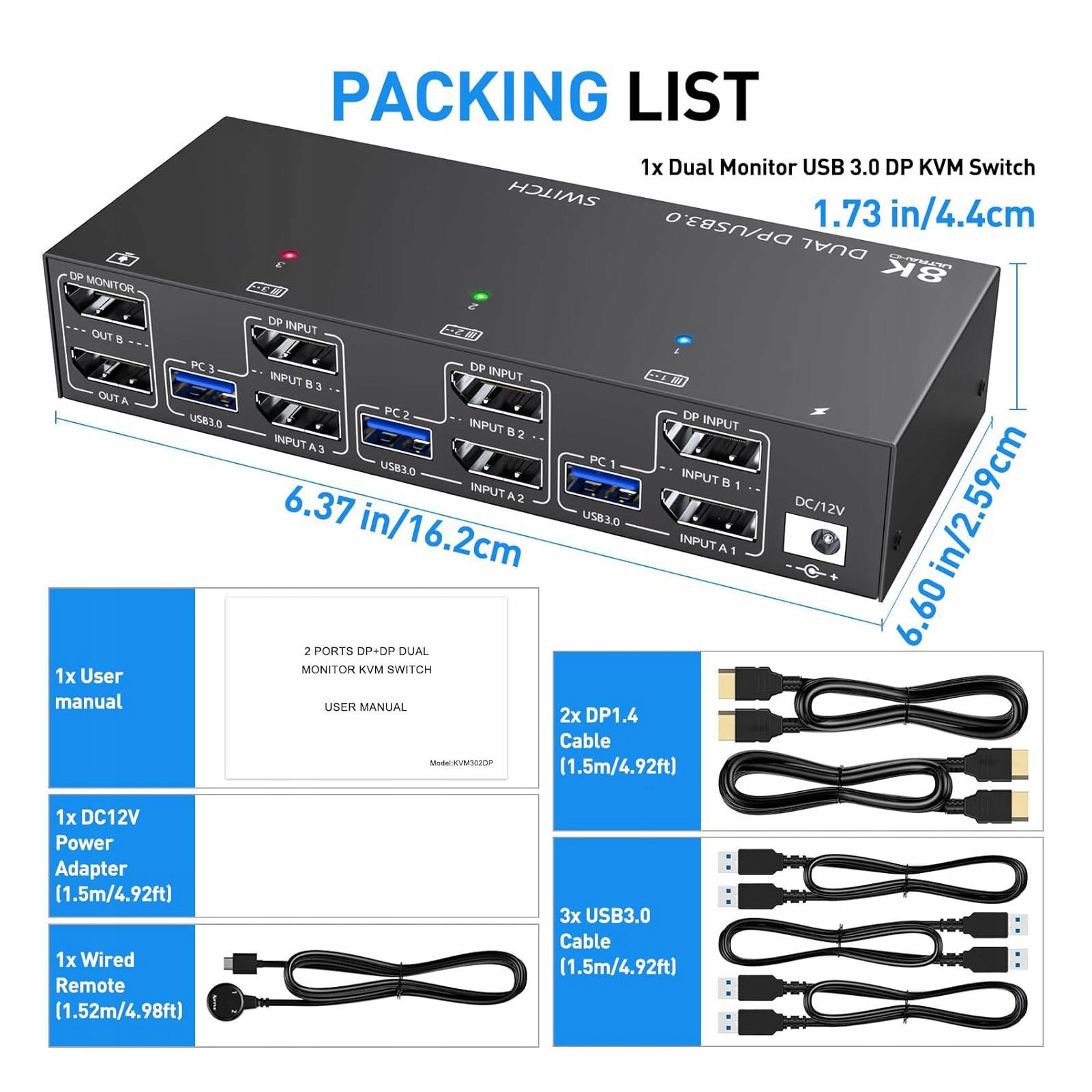 KVM Подвійний DP USB3.0 3 Вхід перемикачів 2 виводить копію та 4o