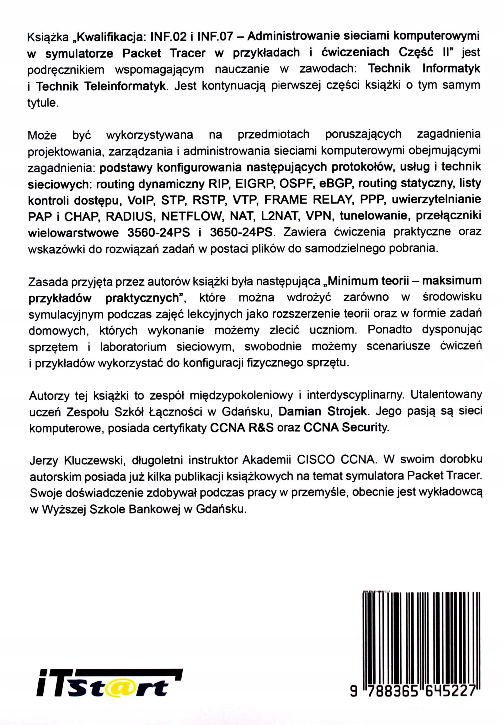 Книга "Кваліфікація: INF.02 і INF.07 - Адміністрування комп'ютерних мереж у симуляторі Packet Tracer у прикладах і вправах, Частина ІІ" є підручником для підтримки викладання наступних професій : ІТ-технік та ІКТ-технік. Вона є продовженням першої частини однойменної книги. Його можна використовувати в предметах, пов’язаних із проектуванням, керуванням та адмініструванням комп’ютерних мереж, зокрема: основи налаштування наступних протоколів, служб і мережевих методів: динамічна маршрутизація RIP, EIGRP, OSPF, eBGP, статична маршрутизація, списки контролю доступу, VoIP , STP, RSTP, VTP, FRAME RELAY, PPP, PAP і CHAP автентифікація, RADIUS, NETFLOW, NAT, L2NAT, VPN, тунелювання, багаторівневі комутатори 3560-24PS і 3650-24PS. Він містить практичні вправи та поради щодо розв’язування завдань у вигляді файлів для самостійного завантаження. Автори книги взяли принцип «Мінімум теорії – максимум практичних прикладів», який можна реалізувати як у симуляційному середовищі під час занять як розширення теорії, так і у вигляді домашніх завдань, які ми можемо задавати студентів. Крім того, якщо у нас є обладнання та мережева лабораторія, ми можемо вільно використовувати сценарії вправ і приклади для налаштування фізичного обладнання. Автори цієї книги — міжпоколіна та міждисциплінарна команда. Талановитий учень Шкільного комплексу зв’язку в Гданську Даміан Строєк. Його пристрасть – комп’ютерні мережі, він має сертифікати CCNA R&S та CCNA Security. Єжи Ключевський, багаторічний інструктор Академії CISCO CCNA. Він уже є автором кількох книжкових публікацій про симулятор Packet Tracer. Він отримав свій досвід, працюючи в промисловості, і зараз є викладачем Університету WSB у Гданську.